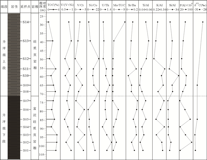 In order to discuss the relationship between sedimentary enviroment and organic matter accumulation in black shale of Middle Ordovician Shengping Formation, the Xishuiyuan Section in Wenqiao Town, Quanzhou County, northern Guangxi was chosen. The organic carbon content, kerogen carbon isotope, major and trace elements were analyzed to investigate paleo-redox, paleo-productivity, hydrothermal sedimentation, clastic influx and water limitation of the Middle Ordovician sedimentary environment in the northern Guangxi. The results show that the lower member of Shengping Formation is mainly composed of mud-rich siliceous shale with TOC of 1.45%-3.04%, and the upper member is mainly composed of siliceous shale with TOC of 0.63%-2.69%. The source of organic matter in the lower member of Shengping Formation is mainly type I kerogen, while the source of organic matter in the upper member may be type II kerogen in addition to type I kerogen. The sedimentary period of Shengping Formation in northern Guangxi is a suboxic and anoxic deep-water shelf and basin facies environment. The organic matter accumulation of mud-rich siliceous shale is a dual control pattern of productivity and preservation conditions. The organic matter accumulation of siliceous shale is a preservation condition pattern.
