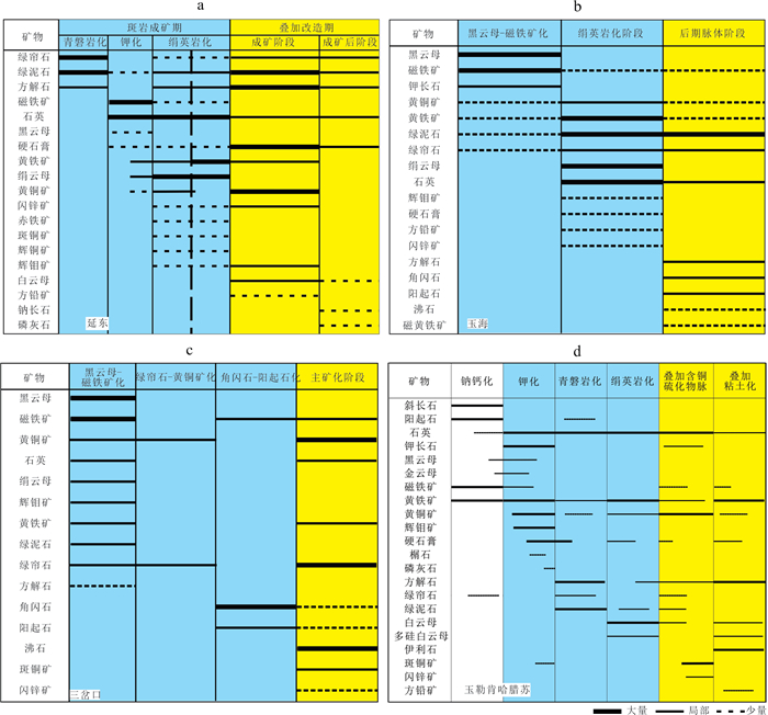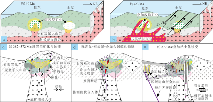 With the advance of green energy transformation in the 21st century, the demand for copper has surged dramatically and porphyry copper deposits as the main suppliers of global copper resources have been paid great attention from both academic and industrial communities. Although a set of classic models have been established for Cenozoic porphyry copper deposits, the porphyry copper deposits located at Paleozoic Central Asian Orogenic Belt exhibit unique characteristics and their genesis mechanisms are not fully understood. Taking important porphyry copper deposits in Xinjiang as research objects, this study reveals that these deposits generally experienced multiple magmatic activities with time spanning up to 100-200 Ma and often underwent superimposed and/or modification mineralization stages after porphyry mineralization. For example, the Tuwu-Yandong deposit has mineral assemblages of anhydrite, chalcopyrite, calcite, and chlorite after porphyry mineralization; the Yuhai-Sanchakou mining area exhibits post-porphyry veins of epidote, quartz, chlorite, zeolite, and calcite; and the Halasu copper belt shows late alteration and mineralization with copper-bearing sulfide veins and argillic alteration. Fluid inclusion studies further confirm that new fluid systems would overprint on the hydrothermal fluid system in the porphyry stage. Based on these observations, it proposes a new superimposed mineralization model of modification for Paleozoic porphyry copper deposits in Xinjiang. In the early stage of island arc evolution, pre-mineralization magmatic activities may form unmineralized alterations in the mining areas such as early sodic-calcic alteration and epidote alteration at the Halasu belt. With the maturity of the island arc, tectonic triggers such as flat subduction facilitated high oxygen fugacity, water-rich magmatic activities which partly have adakite-like geochemical features and formed the porphyry-type mineralization and alteration in the mining areas such as diorite porphyry in Tuwu-Yandong and diorite porphyry and granodiorite porphyry at Halasu. Further tectonic evolution including change of subduction polarity or postcollisional asthenospheric upwelling led to new magmatic hydrothermal activities superimposed on preexisting porphyry-type mineralization and alteration. Moreover, post-mineralization tectonic metamorphism may also introduce new mineralizing materials or cause remobilization of preexisting ores. The aforementioned models underscore the importance of specific tectonic or magmatic activities that may superimpose on pre-existing porphyry mineralization systems in long-lived arcs with sustained multistage magmatic activities. These activities, beyond the classic types of porphyry mineralization alteration, require special attention due to their exploration potential to introduce new mineralizing components.