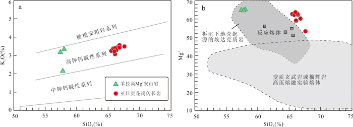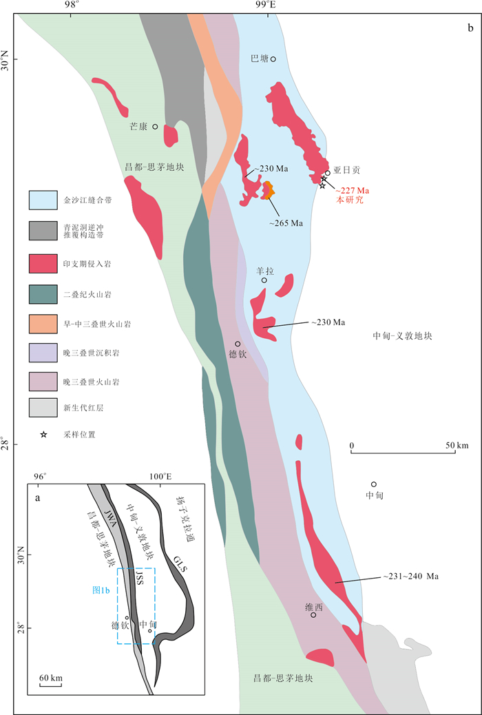 The Paleo-Tethyan Ocean, represented by the Jinshajiang River suture in eastern Tibetan Plateau, was consumed and closed in the Early-Middle Triassic, but the specific process after the oceanic crust demise is still poorly constrained. The potential for porphyry copper mineralization of magma generated in post-subduction setting remains unclear. In present study, geochronological and geochemical analyses were carried out on the Yarigong pluton in Batang area. Magmas were intruded in Late Triassic as corroborated by zircon U-Pb mean age of about 227 Ma. Rocks from this intrusion were characterized by high SiO2 (65.5% to 67.6%) and Mg# (53 to 64), as well as high initial 87Sr/86Sr values (0.709 8 to 0.711 8) and low εNd(t) values (-7.4 to -8.0). Magma generation of the Yarigong pluton resulted from interaction between melts derived from continental crust and peridotite mantle, and partial melts of the continental crust was likely associated with the break-off of early subducted Paleo-Tethyan oceanic slab. Geochemical compositions of amphibole and zircon suggest high magma H2O contents (>5%), the oxygen fugacity of magma is lower than magma related to typical porphyry Cu deposits, and extremely low S in magma was indicated by consistent low SO3 in apatite. These conditions imply barren magma for porphyry Cu deposit formation.