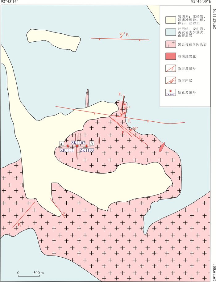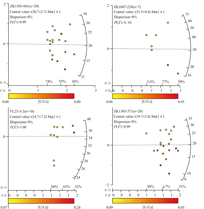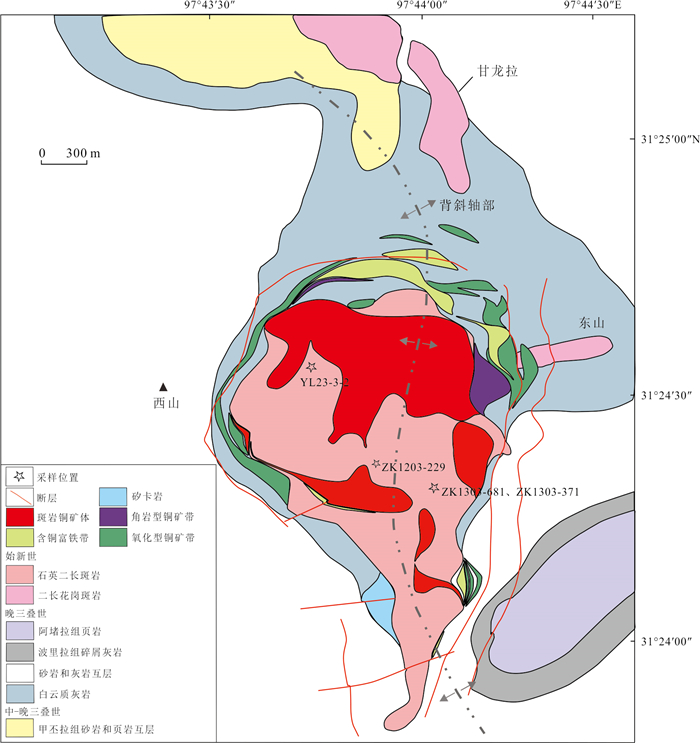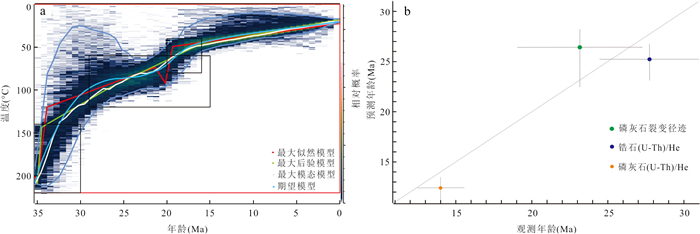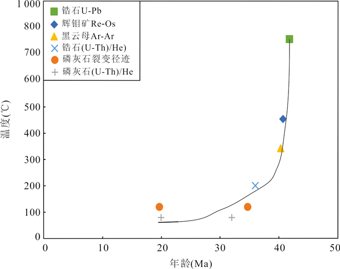 The Yulong porphyry copper deposit is the only super-large porphyry deposit in the Yulong porphyry copper belt, and the previous research on this deposit is primarily focused on genesis, with limited emphasis on the significance of post-metallogenic transformation in formulating prospecting strategies. Thermochronological methods such as zircon U-Pb, apatite fission track, apatite and zircon (U-Th)/He were employed to date and conduct related thermal history inverse modellings. The results indicate that the zircon U-Pb concordant age of the monzogranite porphyry of the Yulong deposit is (41.7±0.5) Ma, with zircon (U-Th)/He age ranging from 34.9 Ma to 39.3 Ma, indicating that the magmatic-hydrothermal evolution process of the Yulong deposit may have lasted at least 5 Ma. The apatite fission track ages range from 34.7 Ma to 19.7 Ma, while apatite (U-Th)/He ages range from 20.7 Ma to 18.4 Ma. These sequentially decreasing ages are indicative of the timing of cooling and exhumation events. The inverse thermal history modelling indicates that the Yulong deposit has undergone a roughly three-stage cooling process, combined with the regional tectonic evolution data, and the relatively rapid cooling between 34 Ma and 30 Ma may be related to the rapid uplift of the Qinghai-Xizang Plateau, resulting from the ongoing collision between the India and Eurasian continents during this period. The relatively slow cooling observed between 30 Ma and 21 Ma could be linked to the weakening collision activity. The relatively rapid cooling between 21 Ma and 14 Ma may be associated with the crustal thickening event in the North Qiangtang terrane, triggered by tectonic shortening or magma inflation during this period. Utilizing the thermal history simulation method, the exhumation amount of Yulong deposit is 3.45 km, Considering the 4- 5 km of metallogenic depth of Yulong deposit, there is still 0.5-1.5 km of prospecting space in the deep part of the deposit.