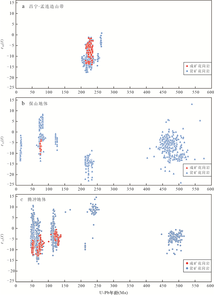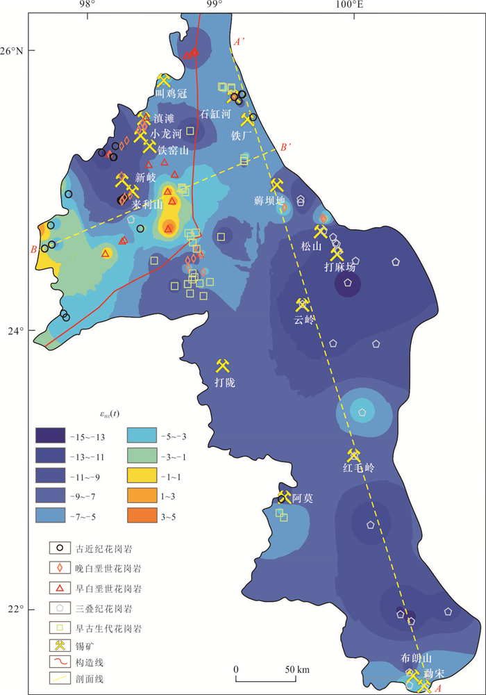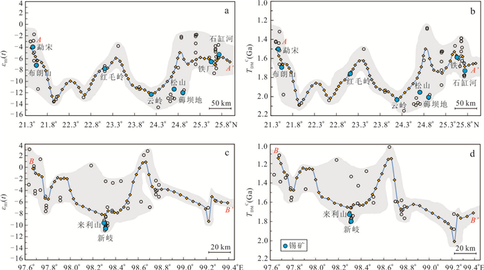 The Southwest Yunnan Tin Belt is one of the most important tin metallogenic belts in China. The temporal and spatial distribution of granite-related tin deposits in the Southwest Yunnan Tin Belt has been summarized, but the relationship between the spatial distribution of tin deposits and the nature of the crust, as well as the reasons for its constraints on tin mineralization, are still unclear. In this paper, published zircon Hf isotope data of Early Paleozoic-Cenozoic granites in Southwest Yunnan are collected. Based on previous large-scale isotope mapping of the Sanjiang Tethys orogenic belt, the εHf(t) value and TDMC contour maps and two typical profiles in Southwest Yunnan are drawn by ArcGIS software. The mapping results show that the Changning-Menglian orogenic belt and Baoshan terrane are ancient crustal domains with low εHf(t) and high TDMC, while the Tengchong terrane has uneven isotopic distribution, and there are both ancient crustal regions with low εHf(t) and high TDMC, as well as newly formed crustal regions with high εHf(t) and low TDMC. The distribution of tin deposits in Southwest Yunnan is closely related to crustal properties. Tin deposits are all distributed in ancient crustal areas with low εHf(t) and high TDMC, while no tin deposits have been found in the newly formed crustal areas with high εHf(t) and low TDMC. The concentrated production of tin ore in ancient crustal regions may be related to ancient tin rich crust. The mixing of low tin and high oxygen fugacity mantle magma has an inhibitory effect on the enrichment of tin in granite, which may be the reason for the unclear tin mineralization in the newly formed crustal area.