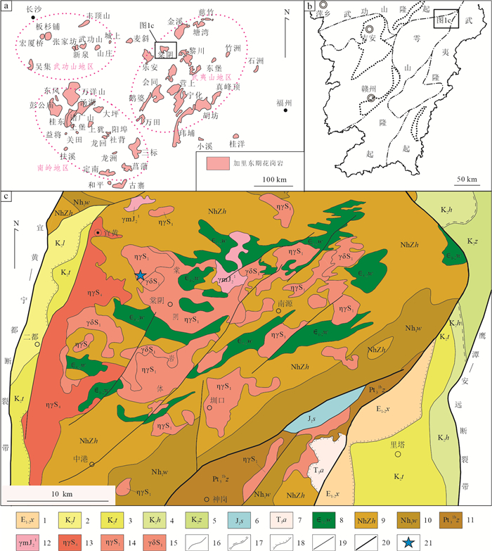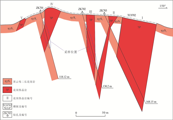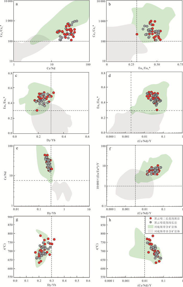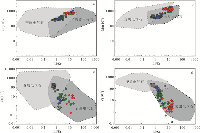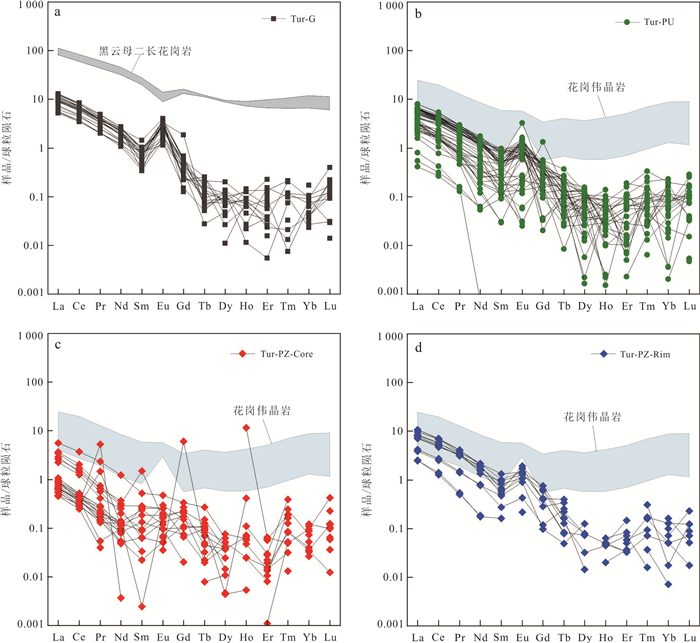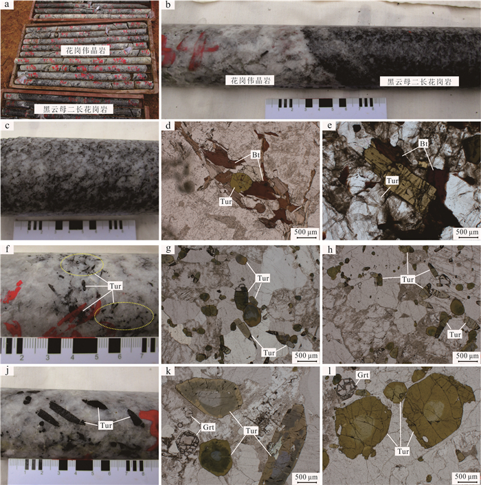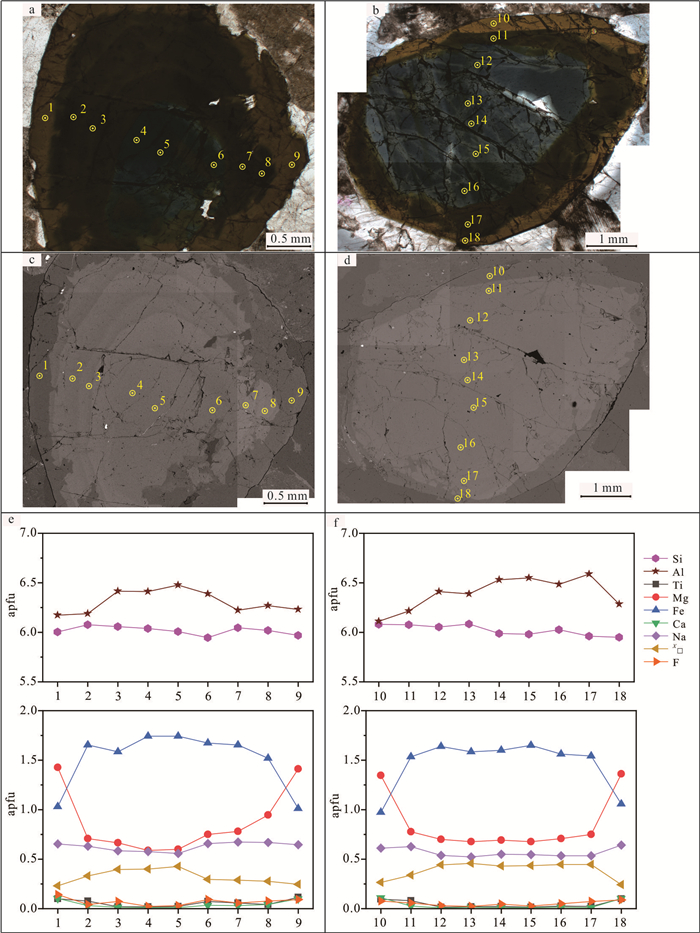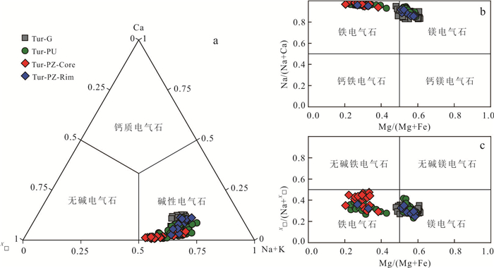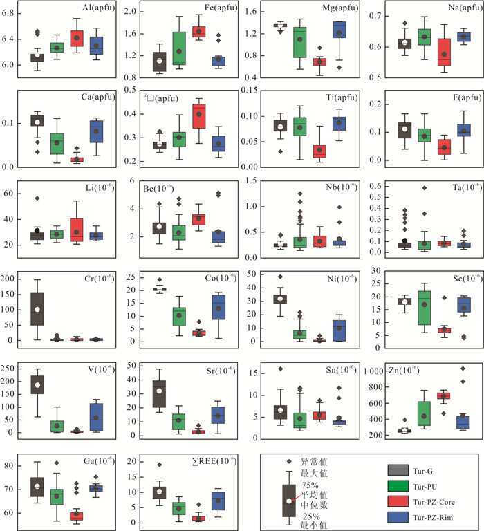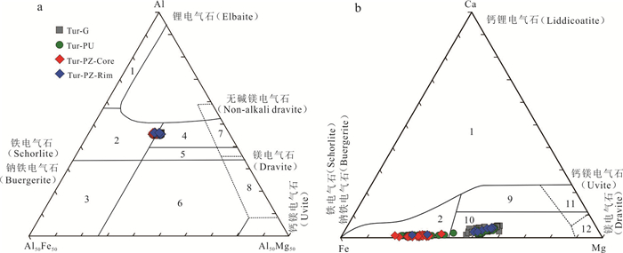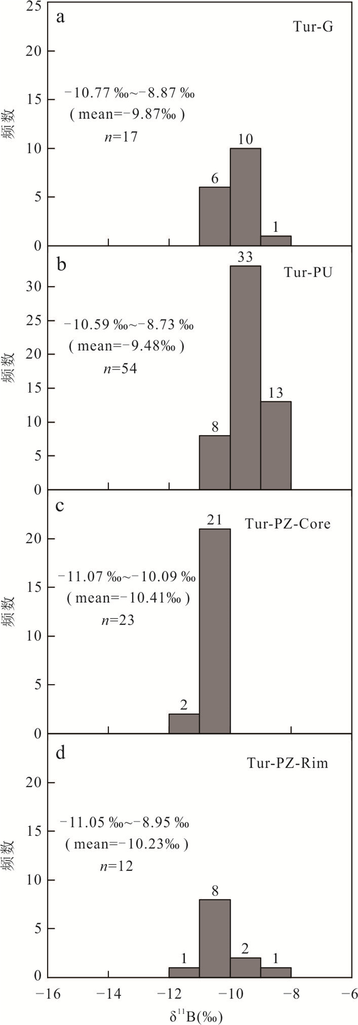 Granitic pegmatite is extensively developed in the Yihuang area of Jiangxi Province, and tourmaline is commonly found within granitic pegmatite and its surrounding rocks (biotite monzogranite). Three distinct types of tourmalines have been identified in Tangyin area: randomly disseminated tourmaline (Tur-G) in biotite monzogranite, unzoned tourmaline (Tur-PU) and zoned tourmaline (Tur-PZ) in granitic pegmatite. However, the classification and origin of tourmaline, as well as its implications for the genesis of granitic pegmatite, remain unclear. This study analyzed the major, trace elements, and boron isotopic compositions using EPMA and LA-(MC)-ICP-MS. From Tur-G type→Tur-PU type→Tur-PZ tourmalines core to rim, the concentrations of Al and Fe initially increase and subsequently decrease, whereas the concentrations of Mg, Na, Ca, Ti, Sc, V, Cr, Co, Ni, Sr, Ga, and rare earth elements exhibit an opposite trend, decreasing first and then increasing. The δ11B values for Tur-G, Tur-PU, Tur-PZ type tourmalines core and rim are -10.77‰--8.87‰, -10.59‰--8.73‰, -11.07‰--10.09‰, and -11.05‰- -8.95‰, respectively. It is believed that all tourmalines belong to the iron-magnesium tourmaline series within the alkaline tourmaline group and are of magmatic origin. Specifically, Tur-G, Tur-PU, and Tur-PZ tourmalines crystallized during the late granite melt, the early granitic pegmatite melt, and the late magma-hydrothermal stages, respectively. The changes in the Fe3+/Fe2+ ratio and V content of the tourmaline revealed that the oxygen fugacity of the magma melt exhibit a trend of initially decreasing and subsequently increasing. The concentrations of Mg, Na, Ca, Ti, Sc, V, Cr, Co, Ni, Sr, and Ga in the tourmaline reflect variations in elemental composition within the melt. The tourmaline found in both the Tangyin granitic pegmatite and biotite monzogranite exhibits a concentrated and comparable boron isotope composition, ranging from -11.07‰ to -8.73‰. This similarity suggests that both rock types originated from the same magma source, with the initial magma being derived from the partial melting of the continental crust, specifically calcium-poor and aluminum-rich metamorphic mudstone and sandstone.