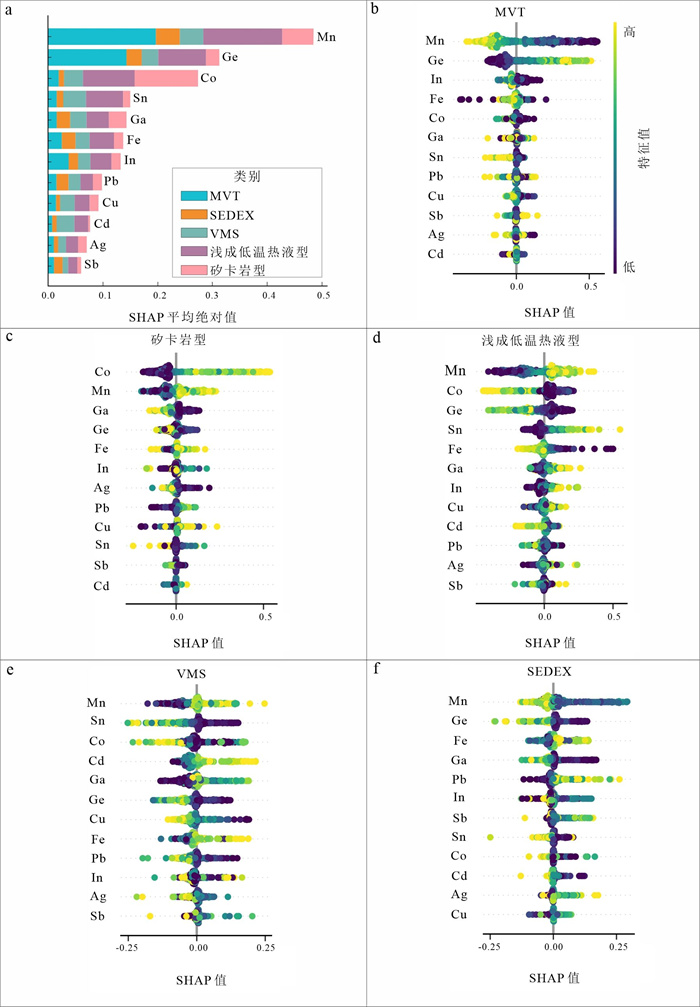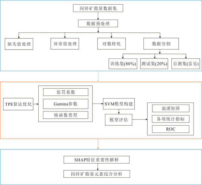 This study demonstrates the efficacy of machine learning algorithms in classifying genetic types of Pb-Zn deposits through trace elements in sphalerite. It compiled a comprehensive trace element dataset comprising 3 117 sphalerite samples from 109 globally representative Pb-Zn deposits including MVT, VMS, SEDEX, skarn, and epithermal deposits. Twelve trace elements (Mn, Fe, Co, Cu, Ga, Ge, Ag, Cd, In, Sn, Sb, Pb) were systematically analyzed to develop a Tree-structured Parzen Estimator (TPE)-optimized Support Vector Machine (SVM) classification model. The model demonstrated exceptional discriminative performance on test datasets, achieving accuracy, recall, and F1-score values exceeding 0.97. SHAP (SHapley Additive exPlanations) interpretability analysis revealed Mn, Ge, and Co as critical discriminators among deposit types, providing quantitative insights into elemental controls on genetic classification. The discriminant index system of trace elements in sphalerite established in this paper not only provides a new technical means for the identification of ore genesis, but also provides innovative solutions for complex geological problems such as the analysis of composite metallogenic system and the prediction of concealed ore bodies.
