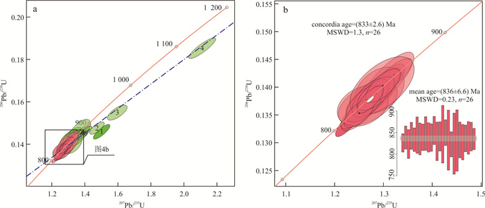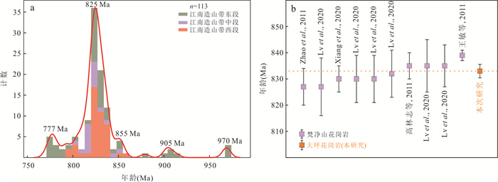 Mantle-derived magmas can serve as a "lithoprobe" for acquiring information about deep Earth materials. In this study, a newly discovered granite xenolith from the Late Ordovician (449 Ma) lamproite at Daping, East Guizhou, was investigated. Zircon U-Pb geochronology, Lu-Hf isotope, and trace element analyses were conducted on the granite xenolith. The results indicate that the concordant zircon U-Pb age of the granite xenolith is (833±2.6) Ma (MSWD=1.3, n=26). The εHf(t) values range from -11.4 to -2.30, and the depleted mantle model ages (TDM) vary from 2 457 to 1 893 Ma. The trace element compositions of zircon, including REEs, U, Th, Pb, Nb, and Hf, suggest that the granite xenolith is an S-type granite related to orogenic processes. The similarity in crystallization ages and Hf isotopic compositions between this granite xenolith and the Neoproterozoic granites exposed in the Fanjingshan region implies that they may collectively form a large granitic batholith at depth. This batholith provides crucial evidence for delineating the northern boundary of the western segment of the Jiangnan Orogen. It is proposed that the boundary between the northern side of the western Jiangnan Orogen and the Yangtze Block should be defined by the Zhangjiajie-Guiyang fault.