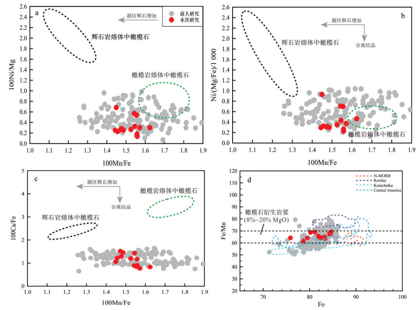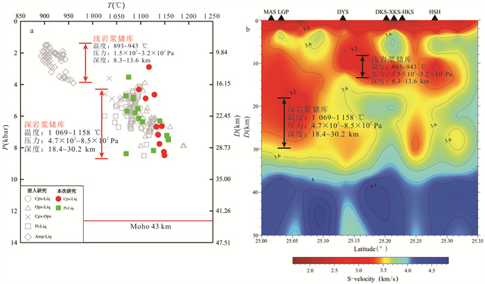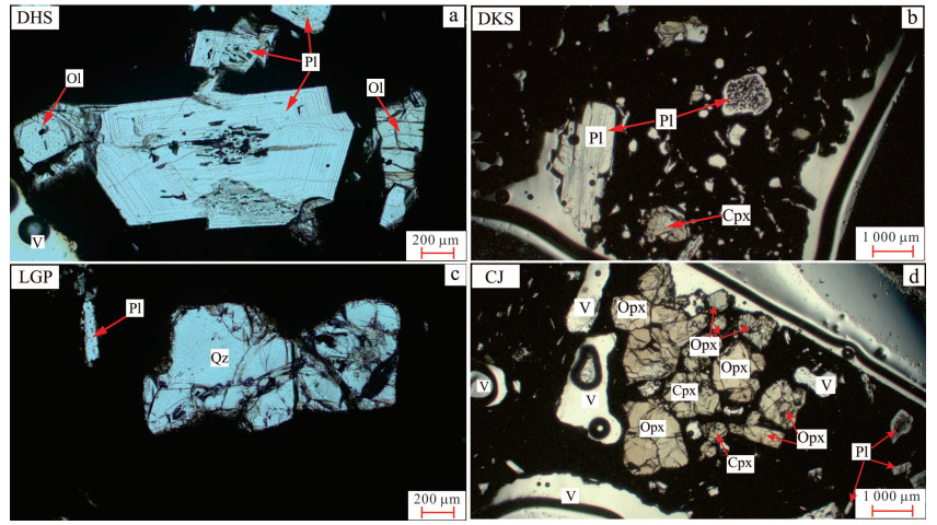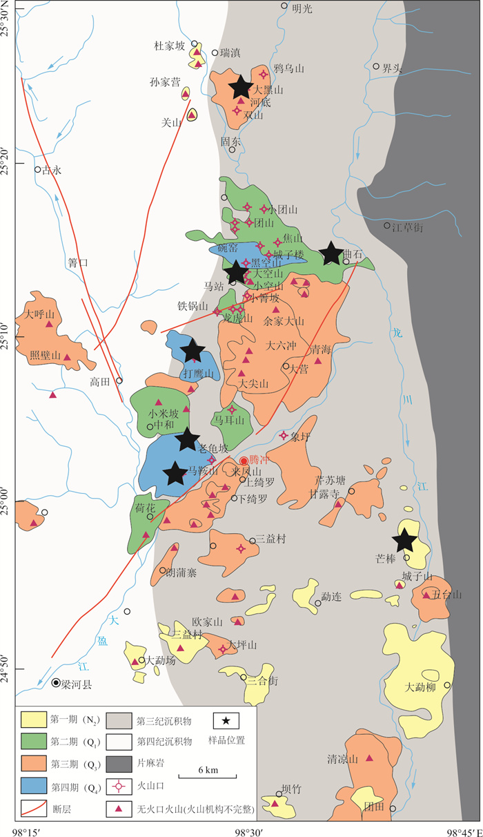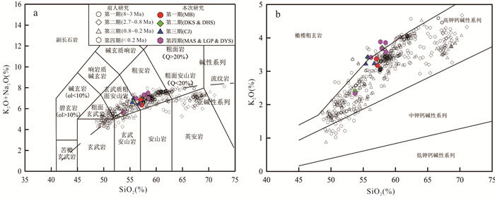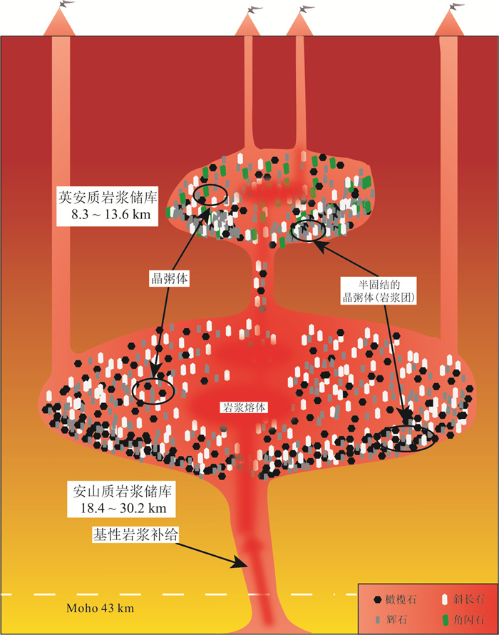 Since the Cenozoic, a large amount of high-potassium calc-alkaline volcanic rocks (basaltic trachyandesite and trachyandesite) have developed in the Tengchong area, but the specific formation process remains unclear. Based on petrographic analysis, in this paper it conducts whole-rock major element and mineral major and trace element analyses of these volcanic rocks, and discusses their formation and evolution process in combination with the published data. The rocks commonly exhibit porphyritic textures, with phenocrysts predominantly consisting of olivine, pyroxene, and plagioclase, and the development of glomerocrysts. Clinopyroxene phenocrysts commonly show normal zoning, reverse zoning, and oscillatory zoning, with oscillatory zoning indicating multi-stage mafic magma replenishment and possible local contamination during magma evolution. Whole-rock major element analysis reveals that these rocks belong to the high-potassium calc-alkaline rock series. Clinopyroxene, orthopyroxene, and plagioclase phenocrysts and glomerocrysts show similar REE and trace element distribution patterns, with clinopyroxene being the most enriched in trace elements, followed by plagioclase, and orthopyroxene showing the lowest concentrations. The geochemical characteristics of olivine phenocrysts suggest that the magma source region may have originated from partial melting of peridotite, while the trace element compositions of the whole rocks and clinopyroxene phenocrysts record geochemical signatures characteristic of an arc-related tectonic setting. The mineral equilibrium temperature-pressure calculations reveal the existence of two intermediate to felsic magma reservoirs beneath the study area: a shallow dacitic magma reservoir (depth 8.3-13.6 km) and a deep andesitic magma reservoir (depth 18.4-30.2 km). The studied samples are derived from the deeper reservoir. Their formation involves mafic magma recharge, triggering mixing between crystal mush and melt; when newly generated melts become dominant within the reservoir, eruption is triggered, carrying semi-consolidated magmatic clots to the surface and forming the typical (glomerocrystic) textures.