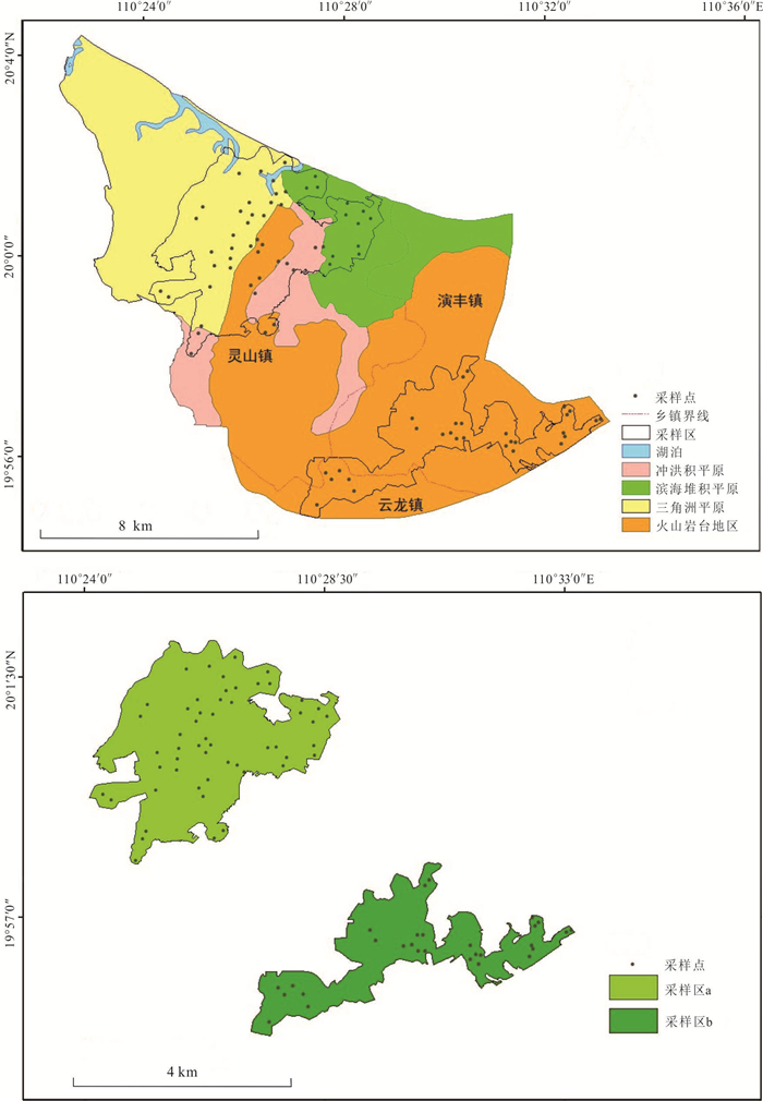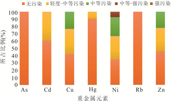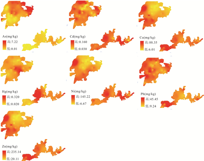 In order to investigate the heavy metal pollution level of soil and rice in the geological high background area dominated by volcanic weathering, taking the west of Jiangdong new district in Haikou as the research object, 82 soil- rice matching samples were collected to measure the contents of As, Cd, Cu, Hg, Ni, Pb and Zn in soil and rice, and the geo-accumulation index method, Nemerow index method, matter-element extension model, the potential ecological risk assessment method were used to evaluate the pollution of farmland soil in the study area, using correlation analysis and PMF model to explore its main sources and contribution rate, and evaluate the health risk of rice consumption. The results show that there are severe Cu, Ni and Zn pollution in the study area, compared with the background value of soil in Hainan Province, the over standard multiples are 2.00, 2.77 and 1.94 respectively, and compared with the risk screening value of agricultural land, the over standard rates are 23.17%, 17.07% and 7.32% respectively. The land accumulation index method shows that As and Pb in farmland soil in the study area are in a pollution-free degree, and the pollution degree of other heavy metals is Ni > Cu > Zn > Cd > Hg, the pollution degree of Ni element is relatively large, and 7.31% of soil samples are of "medium strong pollution". The comprehensive pollution assessment results show that the pollution area is mainly concentrated in the south of volcanic rocks. Combined with PMF source analysis and spatial analysis results, Hg mainly comes from atmospheric sedimentation. The excessive contents of Cu, Ni and Zn are mainly caused by the weathering of volcanic rock soil forming parent material, Pb mainly comes from traffic pollution sources, and the contents of As and Cd are greatly affected by agricultural activities. There is a certain degree of health risk to human body by having rice, and As and Cd are the main contributing factors. The contents of As, Pb and Hg in rice are lower than the national food safety limits, and the over standard rate of Cd reaches 32.93%, there is a certain degree of health risk to human body by eating rice, As and Cd in rice seeds have a great impact on human health risk, with the contribution rates to non carcinogenic risk of 51.52% and 21.57% respectively, and the contribution rates to carcinogenic risk of 73.88% and 26.01% respectively. In conclusion, the farmland soil in the study area is polluted to a certain extent under the joint influence of volcanic rock weathering and human activities, the content of As in rice does not exceed the standard, but it is the largest potential risk element, it is necessary to focus on the health risks of As and Cd in rice produced in the study area, and formulate scientific and reasonable prevention and control strategies for farmland heavy metals.