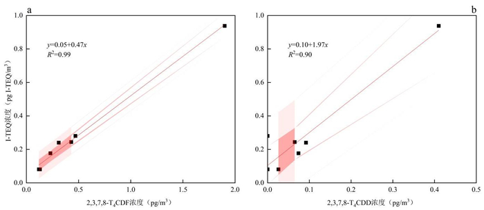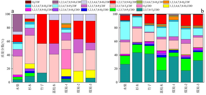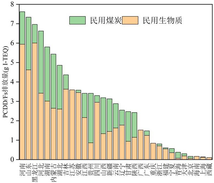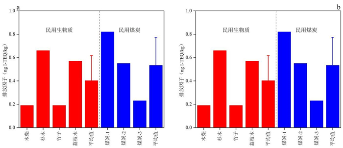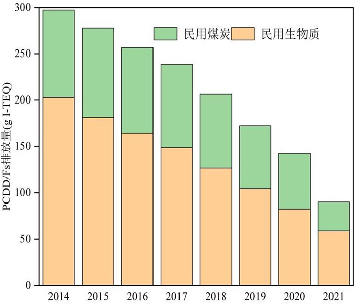 Indoor simulation combustion experiments were performed using a dilution tunnel sampling system. The emission characteristics of PCDD/Fs in PM2.5 from domestic biomass and coal combustion were analyzed using isotope dilution high-resolution gas chromatography/mass spectrometry (HRGC/HRMS), with subsequent calculation of emission factors. By integrating China's fuel consumption and population density data, we developed a "bottom-up" emission inventory for PM2.5-bound PCDD/Fs from domestic biomass and coal combustion in China. The key findings are as follows: (1) The mass concentrations of PCDD/Fs in PM2.5 from domestic biomass and coal combustion ranged from 0.181 to 4.700 pg/m3, with international toxic equivalent (I-TEQ) concentrations of 0.081 to 2.300 pg I-TEQ/m3. Congener analysis revealed that 2, 3, 7, 8-T4CDD (P < 0.01, R2=0.90) showed strong correlations with I-TEQ concentration, suggesting its potential as reliable toxicity indicators for PM2.5-bound PCDD/Fs from domestic biomass and coal combustion. (2) The mass-based emission factors of PCDD/Fs in PM2.5 were (1.82±0.97) ng/kg for biomass combustion and (4.09±2.76) ng/kg for coal combustion. The corresponding I-TEQ emission factors were (0.40±0.21) ng I-TEQ/kg (domestic biomass) and (0.53±0.24) ng I-TEQ/kg (domestic coal). (3) In 2021, the total emissions of PCDD/Fs in PM2.5 from domestic biomass and coal combustion reached 90.0 g I-TEQ. With spatial analysis showing emission hotspots (> 8 μg I-TEQ/km2) concentrated in Northeast and East China. Compared to previous studies, the emissions of PCDD/Fs in PM2.5 from waste incineration (22.56 g I-TEQ) and industrial combustion (208 g I-TEQ) were 0.2 times and 1.5 times those from domestic biomass and coal combustion, respectively. These results highlight that domestic biomass and coal combustion represent non-negligible and substantial sources of PCDD/Fs in PM2.5. (4) The estimated inhalation cancer risks were (9.5±7.2)×10-5 for domestic biomass combustion and (3.1±1.7)×10-5 for domestic coal combustion, representing 3.3-fold and 1.1-fold increases respectively over occupational exposure risks for industrial workers ((2.88±2.45)×10-5).