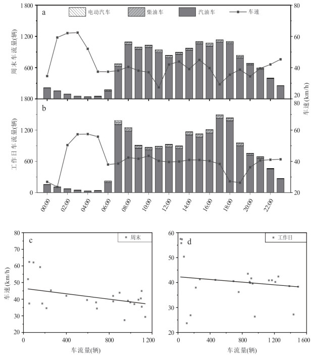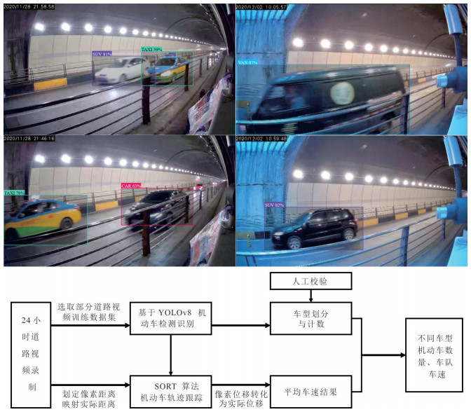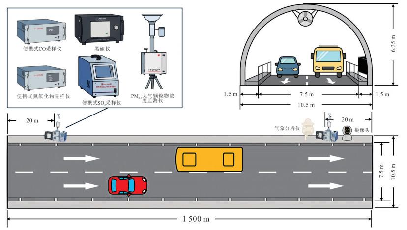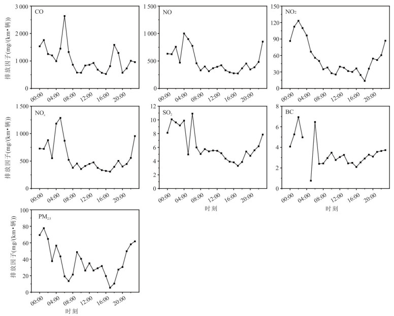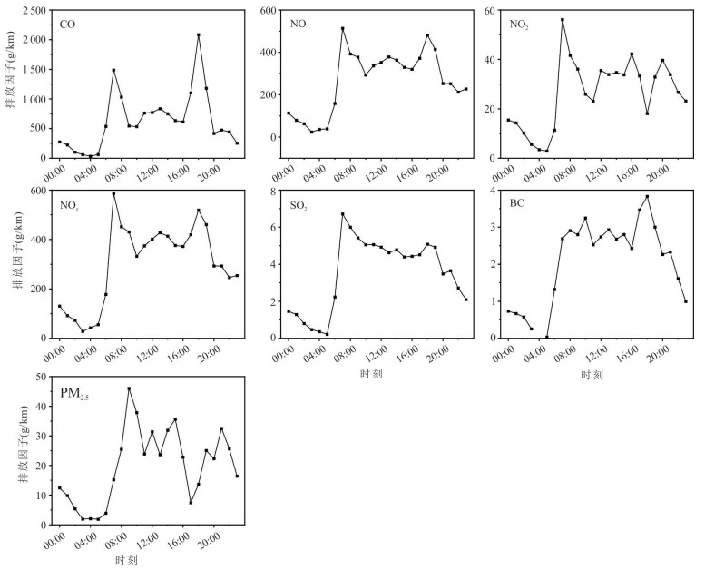Dynamic emission factors of motor vehicle air pollutants are a key parameter limiting the improvement of real-time emission inventory accuracy. In this study, a tunnel in a metropolitan area was selected as an observation site. Real-time monitoring of the concentrations of seven air pollutants (CO, NO, NO2, NOx, SO2, BC, and PM2.5) and traffic flow was conducted using online monitoring instruments and surveillance cameras. Vehicle type and speed were obtained by applying the YOLOv8l deep learning object detection model in combination with the SORT tracking algorithm. Based on the emission intensity ratio method, the average emission factors for the entire fleet and for different vehicle categories were estimated to be (1 064.9±479.8), (496.5±209.3), (55.5±30.4), (578.6±267.6), (6.3±2.2), (3.3±1.5), and (37.7±19.2) mg/(km·veh) for CO, NO, NO2, NOx, SO2, BC, and PM2.5, respectively. The overall fleet emission factors were (634.7±477.2), (266.0±142.9), (26.4±13.5), (302.3±159.5), (3.5±1.9), (2.0±1.1), and (19.8±12.3) g/km for these pollutants, respectively. During the observation period, the average daily traffic volume on weekends was 88.6% of that on weekdays. Except for PM2.5, weekday emission factors for all pollutants were 1.0-1.48 times higher than those on weekends. Hourly analysis showed that the proportion of diesel vehicles during the early morning was 1.6 times that of other periods, with pollutant emission peaks 2.0-3.5 times the daily average. Fleet emissions exhibited a bimodal diurnal pattern, peaking during morning (07:00-09:00) and evening (17:00-19:00) rush hours at 1.8-3.3 times the daily average. The findings provide essential data and scientific support for constructing high-resolution dynamic motor vehicle emission inventories and implementing refined control strategies for vehicular pollutant emissions.