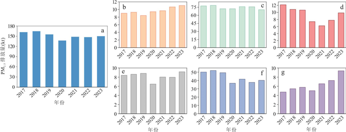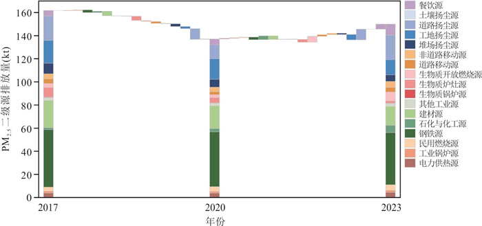 The lack of high spatio-temporal resolution emission inventories for atmospheric fine particulate matter (PM2.5) in the Wuhan metropolitan area limits the accurate simulation and control of regional PM2.5 pollution. In this study, the emission factor method was adopted, integrating point of interest data from Amap as well as relevant allocation indices including population, road network and land use type, etc., to construct a high-spatial-resolution (1 km×1 km) emission inventory of anthropogenic PM2.5 emissions in the region from 2017 to 2023. Its uncertainty was evaluated, and its temporal and spatial evolution patterns were revealed. Results show that the total PM2.5 emissions peaked in 2018 at 164.59 kt, dropped to 137.15 kt in 2020 due to the pandemic, and rebounded to 149.97 kt in 2023. The uncertainty of PM2.5 emissions from various source categories ranged from -31.7% to 42.2%, fossil fuel combustion sources (-13.2% to 35.8%) and process sources (-15.2% to 34.3%) have high uncertainty, while dust sources have the lowest uncertainty (-8.2% to 15.4%). Industrial and dust sources were the main contributors, accounting for 46.5%-52.6% and 26.7%-31.8% of total PM2.5 emissions, respectively. The emission intensity of PM2.5 in urban central area was 600-800 t/km2, which was 40-50 times that in suburban and rural areas. This study can provide reliable high-precision emission inventory data support for improving the accuracy of atmospheric chemistry numerical simulations.