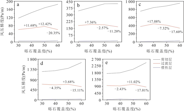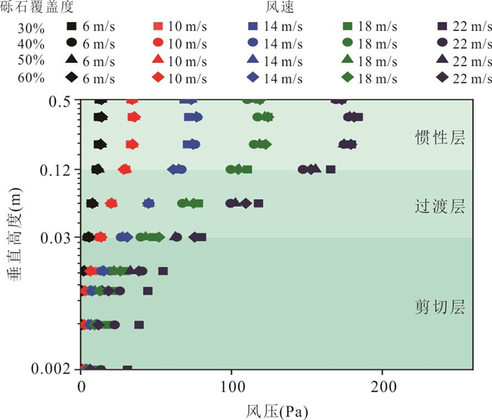 The Gobi Desert is a critical source area for cross-border dust transport, where the interaction between surface gravel coverage and the near-surface wind pressure gradient exerts a significant influence on the dust emission mechanism. Through two-phase flow wind tunnel experiments, the near-surface wind field characteristics of the Gobi were simulated. Nonlinear regression models and two-factor analysis were employed to reveal the regulatory mechanisms. (1) The wind pressure increase exhibits stratified variation, with the wind pressure gradient decaying linearly or exponentially with increasing height. (2) Gravel coverage significantly regulates the vertical differentiation of the wind pressure gradient. (3) Incoming wind speeds directly controls the intensity of the wind pressure gradient, while gravel coverage induces energy absorption and momentum transfer. Surface heterogeneity in the Gobi Desert dynamically regulates wind pressure gradient through the interplay between near-surface roughness and wind forces. Maintaining optimal gravel coverage (40%-50%) effectively balances aeolian erosion control and momentum transfer, providing a mechanistic foundation for refining dust emission models and developing precision windbreak-sand stabilization strategies in arid ecosystems.