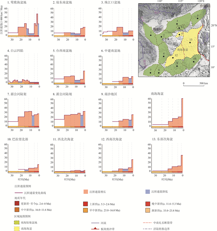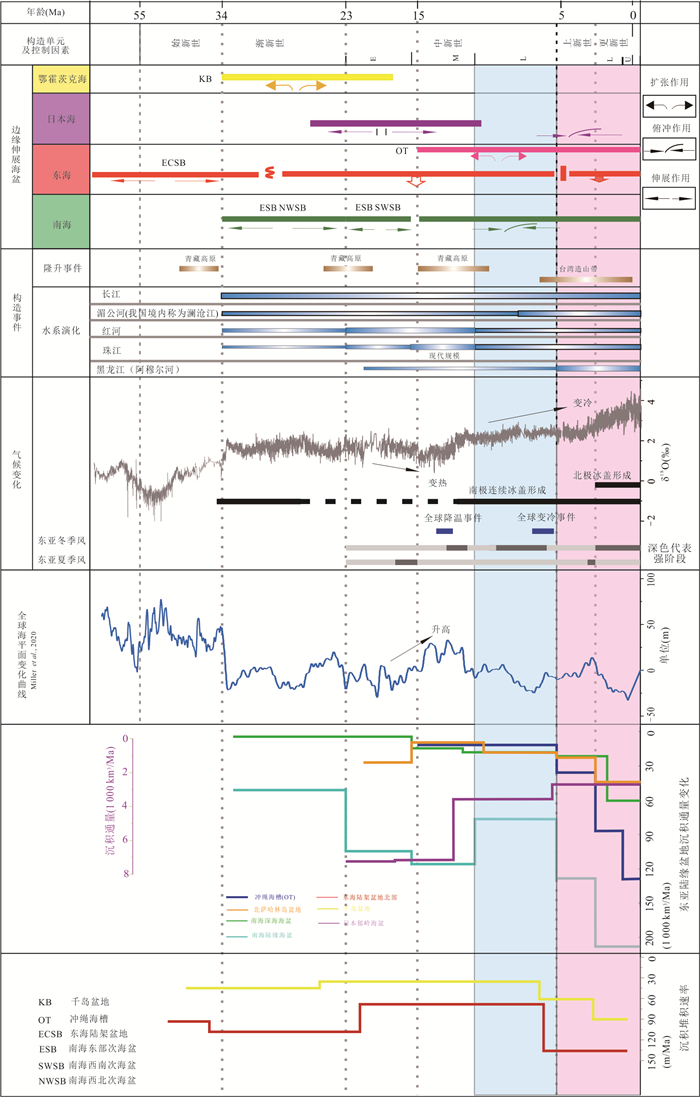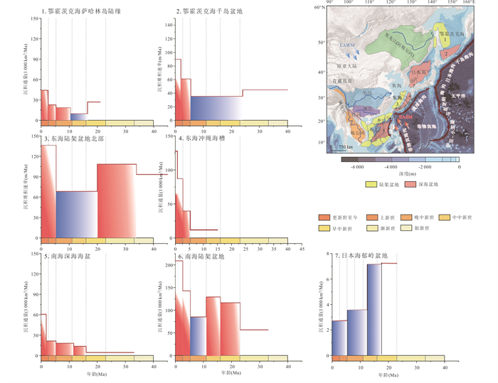 The East Asian continental margin located at the convergent and collisional boundary of the Pacific Plate and the Eurasian Plate, is not only the most tectonically and climatically active region in the world, but also an important place of the sedimentary "source to sink" process since the Cenozoic, However, the sedimentary dynamic processes and key controlling factors of basins at different latitudes remain unclear. This study calculates and statistically analyzes Cenozoic sedimentary flux in high-latitude (Okhotsk Sea), mid-latitude (Japan Sea, East China Sea), and low-latitude (South China Sea) basins. It is found that the evolution of sedimentary flux along the East Asian continental margin shows pronounced latitudinal differentiation: Mid- to Low-latitude basins (South China Sea, East China Sea, and Japan Sea) are primarily influenced by the coupling of tectonics, East Asian monsoon, and river systems. During the Late Miocene (11.6-5.3 Ma), the uplift of the Tibetan Plateau resulted in river reorganization and the intensification of the East Asian winter monsoon, reducing sedimentary flux by approximately 1/3 compared to the Middle Miocene. Since the Pliocene (5.3-0 Ma), the strengthening of the East Asian summer monsoon and the uplift of Taiwan Island increased it by 2 to 3 times compared to the Late Miocene, while the Japan Sea was mainly controlled by monsoon and local tectonics. High latitudes basin (Okhotsk Sea) is subject to the synergy of tectonics and glaciation. During the Middle to Late Miocene (16.0-5.3 Ma), global cooling events caused a decline in sedimentary flux by approximately 60% compared to the Early Miocene. Since the Pliocene (5.3-2.5 Ma), the expansion of the Heilongjiang River (Amur River) basin and the uplift of Sakhalin Island have led to an approximately 2-fold increase in sedimentary flux.