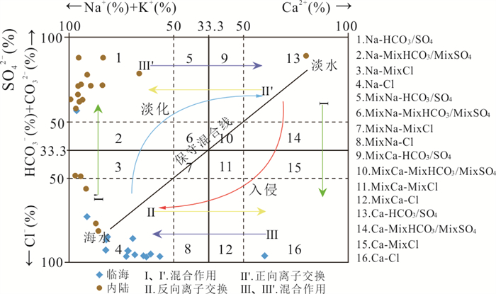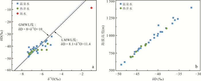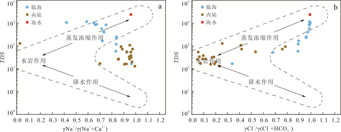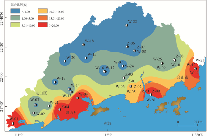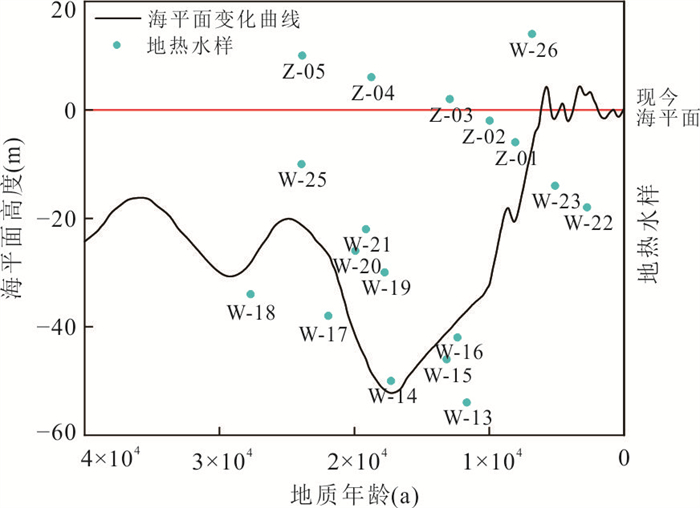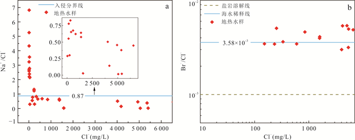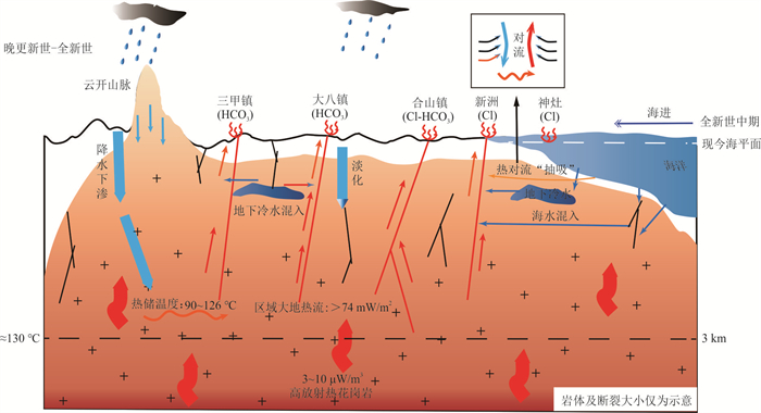 Coastal geothermal systems are prone to seawater intrusion, which can increase the salinity of geothermal water, reduce its utilization efficiency, and raise operational costs. As a significant region for medium-low temperature geothermal resources in China, the coastal areas of Guangdong Province still lack systematic research on seawater intrusion into geothermal systems and its impacts. This study investigates the hydrochemical characteristics, seawater intrusion extent and formation mechanisms based on physicochemical data from 35 geothermal water samples, one cold groundwater sample and one seawater sample in western Guangdong Province. Comprehensive analyses including hydrochemistry, isotopes and multivariate graphical interpretation methods, are employed to explore these aspects. The research results indicate that coastal geothermal water exhibits visible seawater intrusion characteristics with high salinity levels, demonstrating a maximum mixing proportion reaching 41.88%. The hydrochemical types evolve from bicarbonate-type in inland areas to chloride-type in coastal zones. The geothermal water is primarily recharged by atmospheric precipitation. During the Late Pleistocene to Holocene period, infiltrated meteoric water from the Yunkai Mountain and Tianlu Mountain areas interacted with geothermal reservoir rocks at a temperature of 90-126 ℃, undergoing gradual temperature elevation. Subsequently, marine transgression events induced large-scale paleo-seawater mixing into the geothermal system, where seawater migration was accelerated by thermal convection "pumping effects". Thereafter, sustained seawater intrusion has persistently affected coastal areas, ultimately forming medium-low temperature geothermal water with high salinity characteristics.