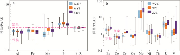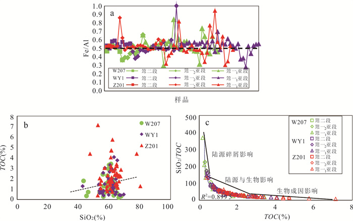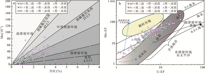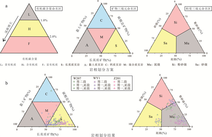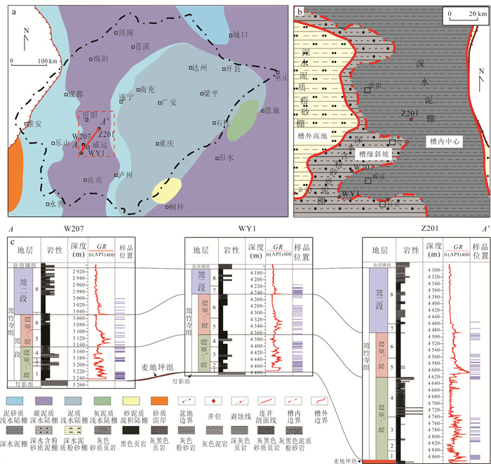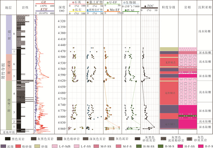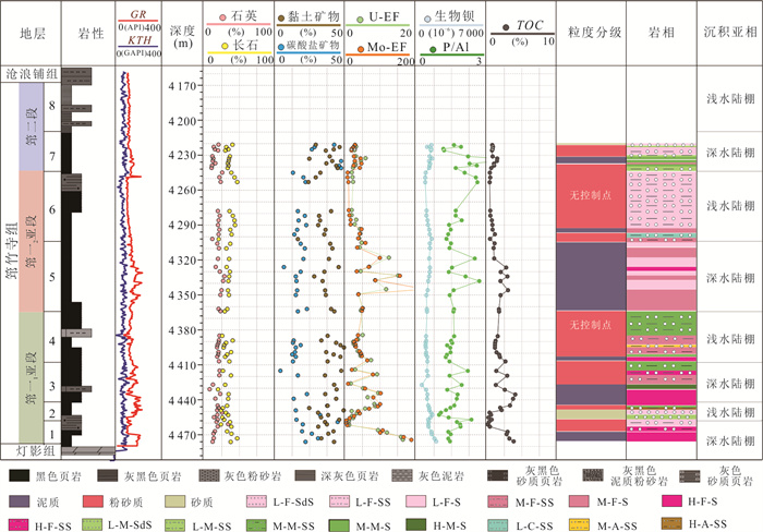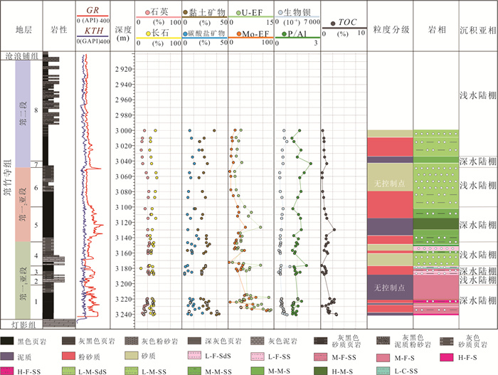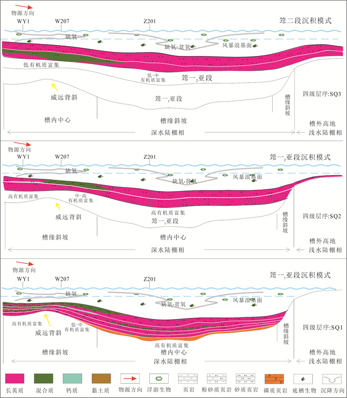 The sedimentation of the Qiongzhusi Formation shale in the Sichuan Basin is controlled by the tectonic-sedimentary differentiation of the Deyang-Anyue Rift Trough. Its lithofacies types and distribution are closely related to sedimentary environments. Based on previous studies of the Qiongzhusi Formation, this research comprehensively uses core observation, thin-section identification, and geochemical testing and analysis to classify the lithofacies types of the Qiongzhusi Formation shale in the middle segment of the rift trough, and discusses the high quality shale lithofacies types and their distribution controlled by sedimentary environments. The results show that: (1) The sedimentary environment within the rift depression exhibits distinct differentiation characteristics. The central part of the depression is dominated by biogenic high-silica deposits, forming a strong reducing environment with a dual-threshold boundary, where ancient productivity and water retention reach their peak; the trough margin is dominated by terrigenous clastic input. Horizontally, it shows a gradational pattern of "oxidizing margin-anoxic trough, " while vertically, it exhibits a cyclic evolution of " anoxic at the bottom-dysoxic in the middle-oxidizing at the top." (2) "TOC-mineral-grain size" coupling lithofacies classification system is established, with 36 lithofacies types divided. It is clarified that 16 lithofacies types develop in the middle segment of the rift trough, such as organic-rich felsic shale (H-F-S) and organic-rich mixed silty shale (H-M-SS), systematically revealing the heterogeneity characteristics of shale and providing new ideas for predicting deep shale gas sweet spots. (3) The high-quality lithofacies are mainly organic-rich felsic shale (H-F-S), organic-rich mixed shale (H-M-S), organic-rich felsic silty shale (H-F-SS), organic-rich argillaceous silty shale (H-A-SS), and organic-rich mixed silty shale (H-M-SS), which are concentrated in the deep-water shelf facies of the 1st, 3rd, 5th, and 7th sub-layers of the Qiongzhusi Formation. The deep-water dysoxic-anoxic environments promote organic matter enrichment and preservation, and high felsic mineral content provides high-quality reservoir spaces. The research results provide key geological bases for the evaluation and development of deep shale gas resources in the Sichuan Basin.
