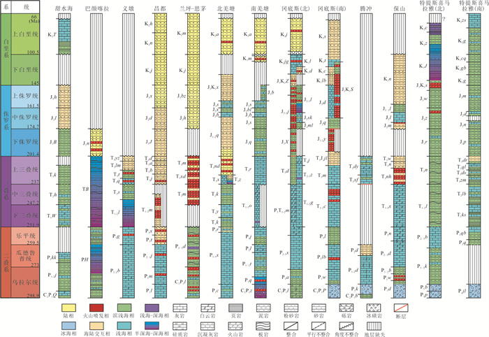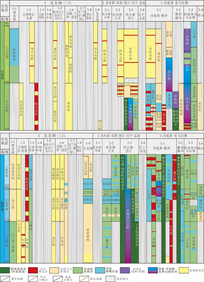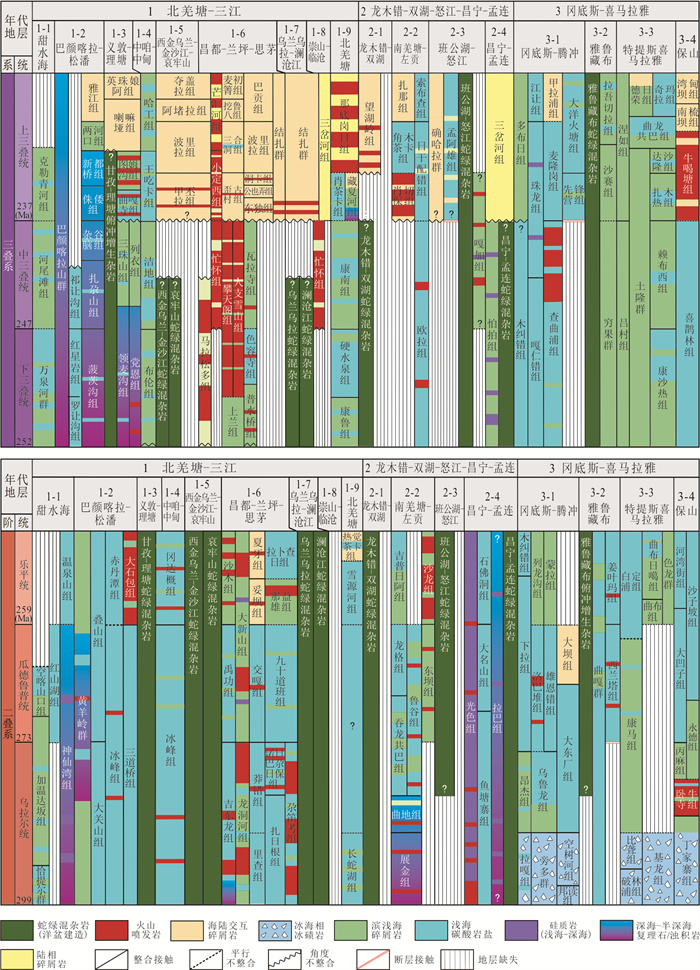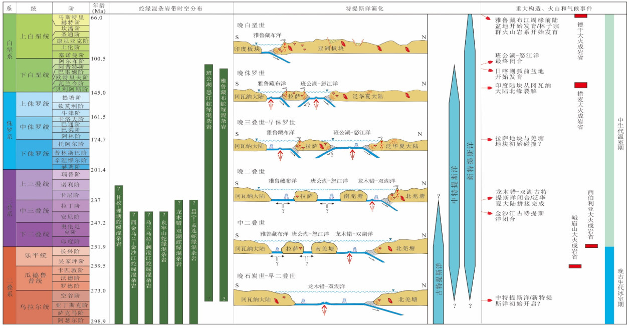 The Late Paleozoic-Mesozoic (Permian-Cretaceous) was a crucial period for major reorganization of the tectonic-paleogeographic pattern of the Tethyan Qinghai-Xizang Plateau. Three first-order tectonic-stratigraphic units (super-realms) and seventeen second-order tectonic-stratigraphic units (realms) have been devised. Through detailed research of lithostratigraphic unit and its characteristics of sedimentary background and contact-correlation relationship for the continental blocks and their closely associated continental arcs, forearc basins, marginal sea basins, micro-continents etc. In each tectonic-stratigraphic units, we have finally established the Late Paleozoic-Mesozoic ocean plate stratigraphy (OPS) framework for the Tethyan Qinghai-Xizang Plateau. In particular, the spatiotemporal distribution of the ophiolite mélange zones in different tectonic-stratigraphic units are highlighted. By systematically researching the temporal-spatial features of the ophiolite mélange zones and their associated island arc-basin systems in Tethyan Qinghai-Xizang Plateau, we reviewed the evolution history of the Paleo-Tethys Ocean (Longmuco-Shuanghu Ocean, Changning-Menglian Ocean), the Meso-Tethys Ocean (Bangong-Nujiang Ocean) and Neo-Tethys Ocean (Yarlung Zangbo Ocean), thus revealing the evolution process of the Late Paleozoic-Mesozoic tectonic-paleogeographic pattern of the Tethyan Qinghai-Xizang Plateau.
