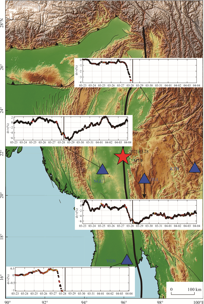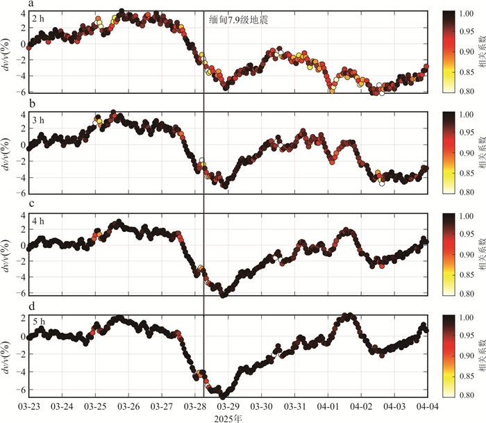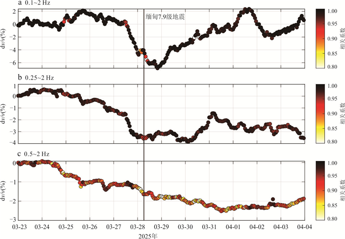 Seismic velocity change serves as a crucial indicator for characterizing the evolution of stress states in subsurface structure, providing significant insights into earthquake nucleation mechanisms, rupture processes, and postseismic adjustments. This study utilizes continuous waveform data from four permanent stations located in the source region of the March 28, 2025, Myanmar M7.9 earthquake. By applying the ambient noise autocorrelation method, we analyze the dynamic changes in seismic wave velocity during the pre-seismic, co-seismic, and post-seismic phases. The results reveal that all stations observed a notable decrease in seismic wave velocity within the frequency range of 0.1-2 Hz during the pre-seismic phase, which may be attributed to pre-seismic slip or progressive changes in the physical properties of the media along the Sagaing large-scale strike-slip fault zone. During the co-seismic phase, the velocity changes exhibit significant spatial heterogeneity, with stations closer to the epicenter showing more pronounced variations, indicating stronger near-field ground motion effects. In the post-seismic phase, the wave velocity gradually recovers over time, likely reflecting the self-healing process of the subsurface media beneath the seismic stations. These findings provide new observational evidence for understanding the seismogenic mechanisms of large strike-slip faults and the post-seismic healing processes of subsurface structure.