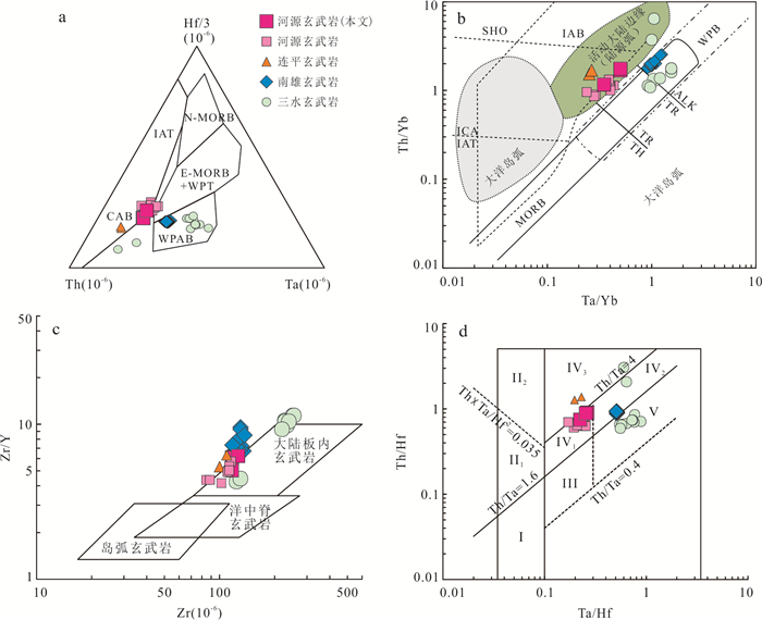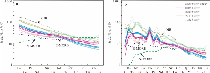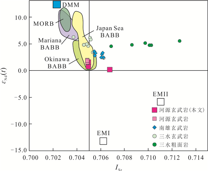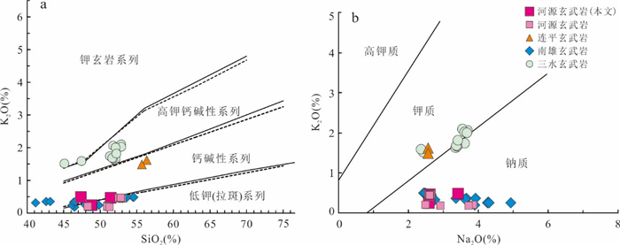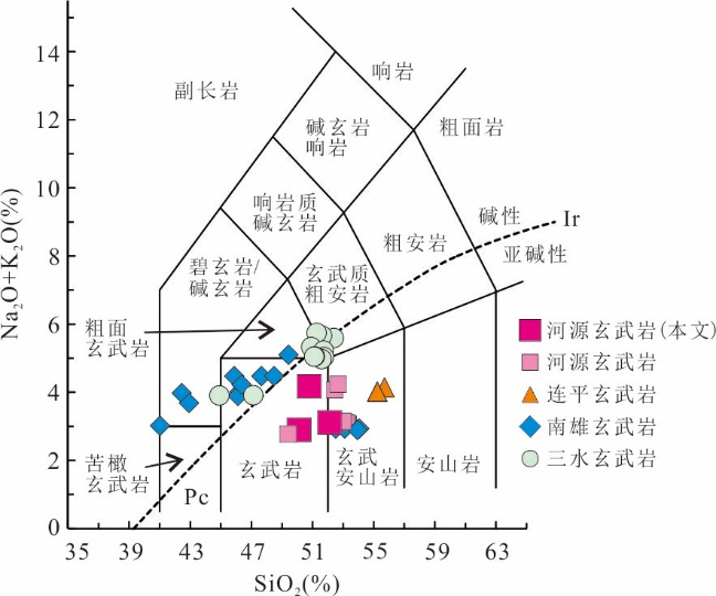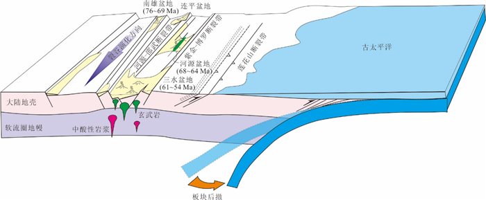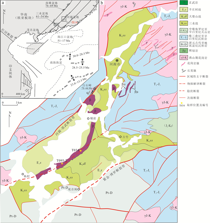 The formation and geodynamic setting of Mesozoic-Cenozoic volcanic rocks in the basins along the South China coast remain controversial, traditionally attributed to either Paleo-Pacific subduction or South China Sea spreading.Focusing on NE-trending fissure-erupted basalts from the Heyuan Basin, this study uses ⁴⁰Ar/³⁹Ar dating to constrain their eruption ages to 68.65-64.52 Ma. These ages coincide with the Cretaceous-Paleogene (K-Pg) boundary.Geochemically, the basalts exhibit sodic subalkaline tholeiitic characteristics (SiO2=47.43%-52.67%), with low Mg, K, and Ti but high Na and Al contents. Their rare earth element (REE) patterns indicate slight light REE(LREE) enrichment ((La/Yb)N=4.48-6.68), lacking significant Eu, Ce, Nb, or Ta anomalies, but displaying positive Ba, Th, and U anomalies and a negative P anomaly. Key elemental ratios (Th/Yb=1.72-1.15, Th/Nb=0.20-0.21, Hf/Th=1.13-1.35) suggest derivation from a depleted lithospheric mantle source with crustal contamination, formed in a continental rift setting.The Sr-Nd isotopic compositions (ISr=0.704 97-0.706 76, εNd(t)=0.11-1.55) indicate that the Heyuan basalts originated from a mixture of depleted mantle and enriched lithospheric mantle components. Regional comparisons with coeval basalts from the Nanxiong, Lianping, and Sanshui basins reveal an NE-SW trending continental rift system along the northern South China margin. This rifting episode likely responded to back-arc extension triggered by Paleo-Pacific plate rollback.