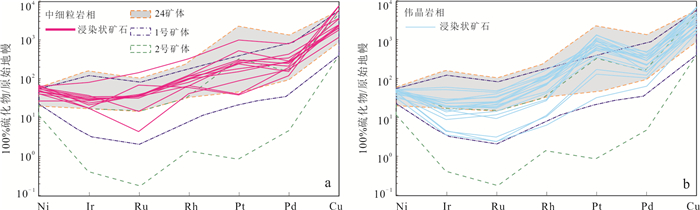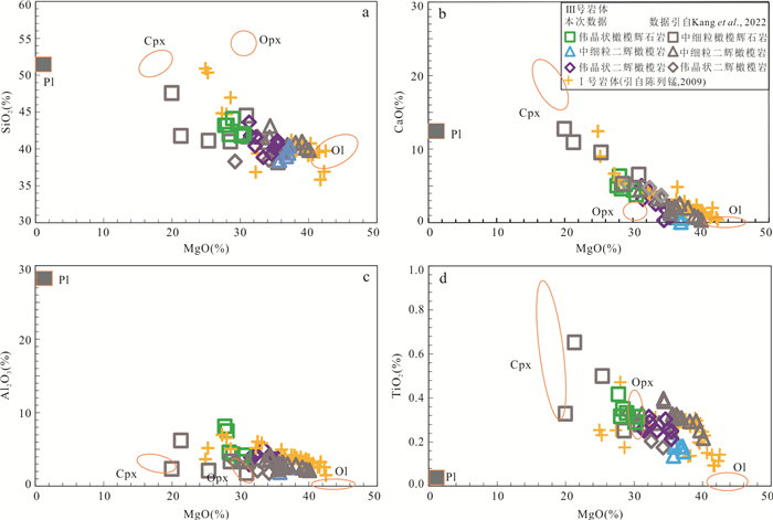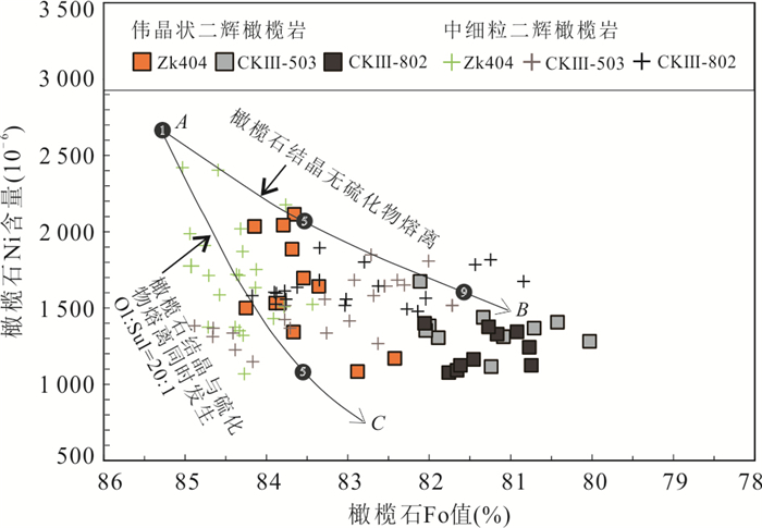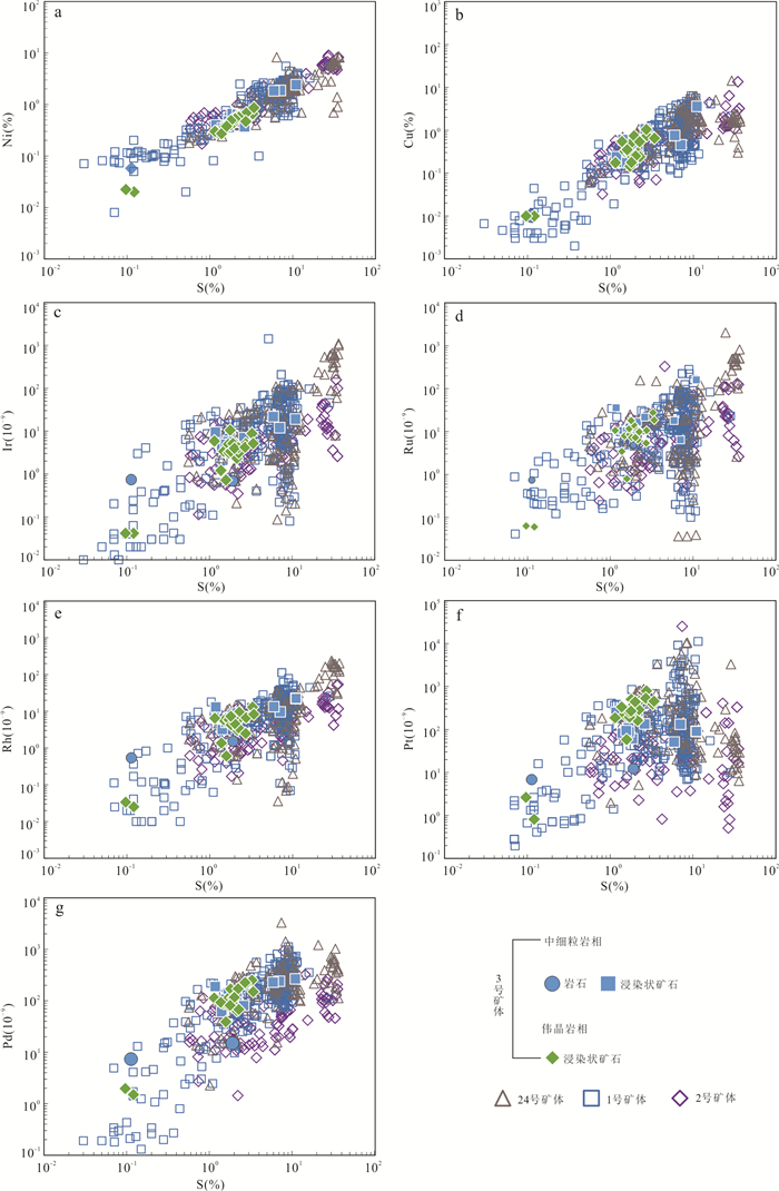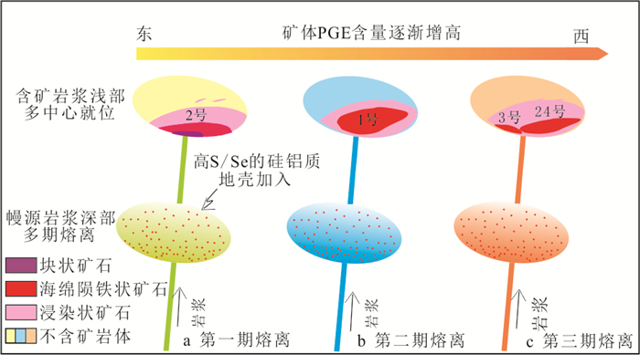 To elucidate the mineralization process of the No.3 orebody of the Jinchuan deposit and to refine the Jinchuan metallogenic model, it conducted EPMA of ore minerals together with whole-rock major-trace element and Ni-Cu-PGE analyses. Olivine from the fine-grained and pegmatitic lherzolite hosting the No.3 orebody shows Fo values of 82.4%-85.0% and Ni contents of 1 069×10-6-2 420×10-6. Both Fo and olivine Ni content increase progressively from the northwest to the southeast. Major-element variations suggest that the No.3 orebody experienced dominantly olivine- and pyroxene-controlled fractional crystallization. The ore-bearing rocks are slightly enriched in light rare earth elements (LREE), markedly enriched in large-ion lithophile elements (LILE), and depleted in high-field-strength elements (HFSE). The total PGE abundances of the No.3 orebody are comparable to those of the No.24 orebody, but are significantly higher than those of the No.1 and No.2 orebodies. Importantly, the southeastern segment of the No.3 orebody remains relatively more mafic and therefore retains greater mineralization potential. These observations support a metallogenic model in which the Jinchuan deposit formed through "mantle-derived magma, sulfide segregation, and multi-center emplacement of mineralized magma". The No.3 and No.24 orebodies were supplied by the same magma conduit, whereas the No. 1 and No. 2 orebodies were fed by separate conduits.