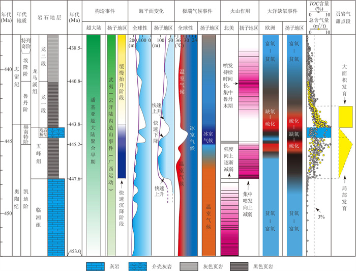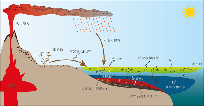 Large-scale volcanic activity is recognized as one of the critical drivers of global climate and environmental changes, as well as biodiversity fluctuations. It can enhance marine surface primary productivity and promote the development of euxinic bottom water conditions, thus facilitating organic-rich sedimentation. Across the Ordovician-Silurian transition, intense global volcanic activities coincided with the widespread deposition of black shales and the development of organic-rich intervals characterized by extraordinarily high total organic matter (TOC≥3.0%). Based on more than 800 samples, including TOC, major and trace elements, mercury (Hg) concentrations and Hg isotopes, collected from over 20 typical wells and sections of the Wufeng-Lungmachi formations in South China, this study discusses the occurrence and identification features of visible volcanic ash layers and highlights the application of major and trace elements, Hg concentrations and isotopes to identify cryptotephra. Furthermore, the impact of volcanic activity on marine environmental changes and the formation of extraordinarily high organic matter deposits were investigated. The results suggest follows. (1) The distribution of visible volcanic ash and cryptotephra provides a robust basis for reconstructing volcanic history of this period. (2) Elevated phosphorus inputs from volcanic activity enhanced marine surface primary productivity and expanded the extent of anoxic bottom water. (3) The anoxic conditions promoted phosphorus recycling, thereby sustaining high primary productivity. (4) Enhanced volcanic weathering increased sulfate input, which could further promote euxinic conditions. Sustained volcanic activities and their associated climate and environmental effects contributed to the high primary productivity and euxinic conditions, ultimately leading to the extraordinarily high organic matter accumulation in the Wufeng-Lungmachi shale.