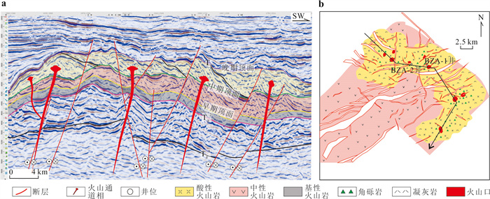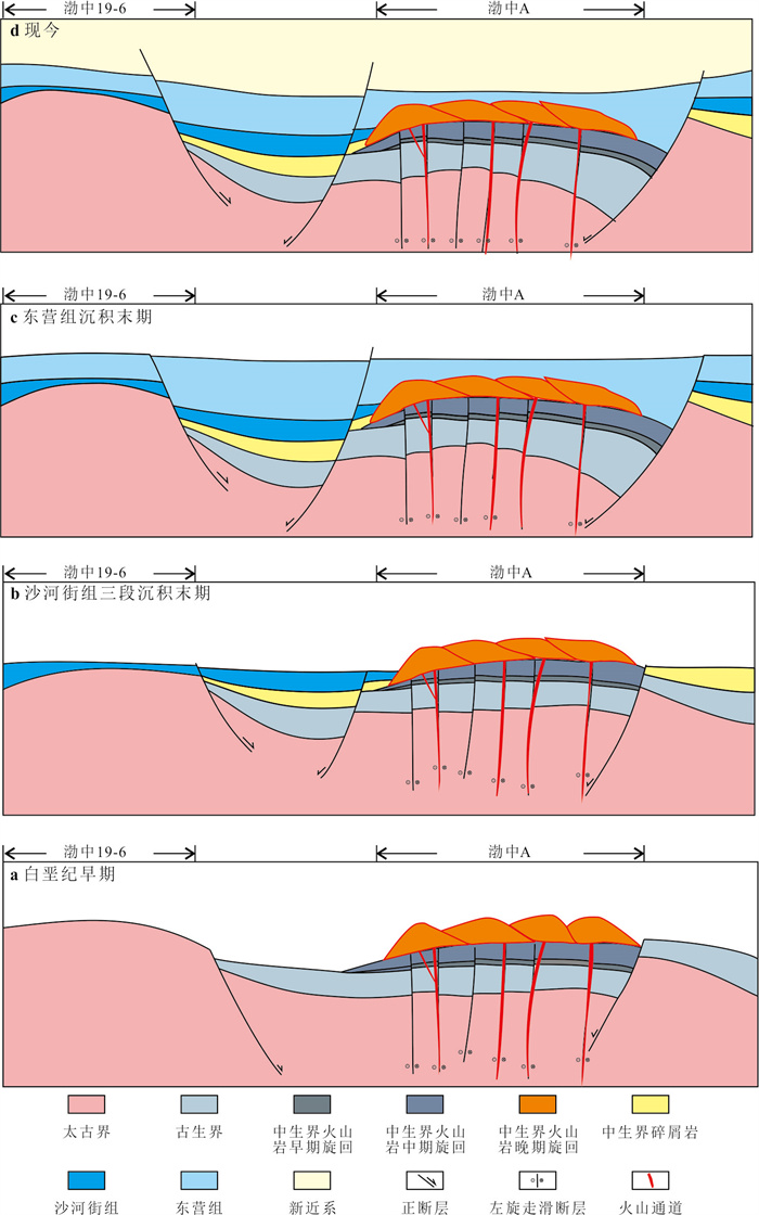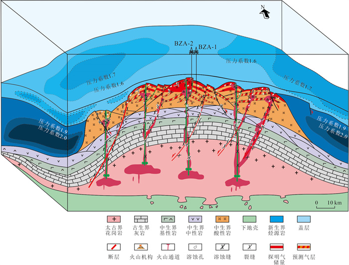 Mesozoic volcanic rocks are widely developed in the Bohai Bay basin. However, the exploration of large-scale volcanic hydrocarbon reservoirs has remained a persistent challenge in deep buried-hill plays in the Bohai area. To investigate the primary controls on substantial hydrocarbon accumulation, this study focuses on the Bohai A Mesozoic volcanic rocks, which have recently achieved significant exploration breakthroughs in the Bohai Sea area, as the research target area. drilling and logging data, sidewall core and thin-section observations, petrochemical analyses combined with 3D seismic, it characterizes the lithology-facies associations, volcanic edifice types, reservoir space characteristics, and key factors governing hydrocarbon accumulation. Research has shown that the BZ-A structure develops three volcanic rock cycles from base to top: basic, intermediate, and acidic. The late stage acidic volcanic rock cycle is composed of multiple large and medium-sized acidic lava volcanic structures stacked together, and is a thick and stable distribution of rhyolite. It mainly develops three types of rock types: effusive facies including vesicular and massive rhyolites, and volcanic conduit facies represented by rhyolitic cryptoexplosive breccia, which have the lithological and lithological basis for developing high-quality volcanic rock reservoirs. Although primary porosity is limited, extensive secondary modification-driven by intense tectonic activity and multi-phase fluid dissolution—has developed abundant structural fractures and dissolution pores/fissures.. The reservoir is vertically divided into a surface weathering dissolution zone and an inner crack dissolution zone with a double-layer reservoir structure, and the overall structure is a large-scale high-quality fracture solution with high porosity and permeability. The favorable factors for oil and gas accumulation in BZ-A include high porosity and permeability acidic volcanic rock fracture solution bodies, ancient uplifted anticline traps, proximity to the Bozhong hydrocarbon rich depression, overlying thick layer overpressure mudstone, and late stage weak tectonic activity. Based on these findings, a comprehensive hydrocarbon accumulation model for ultra deep, large-scale Mesozoic volcanic reservoirs is established, which offers valuable insights for volcanic hydrocarbon exploration in the Bohai Bay basin and analogous settings worldwide.