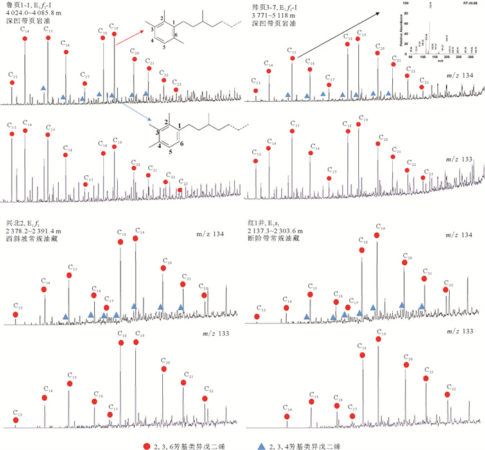 With the continual progressing of shale oil exploration and development in lacustrine facies, the investigation in Qintong sag of Subei basin steps into the stage of whole petroleum system evaluation. The previous oil correlation researches focused on the influence of salinity of lake water during source rock development onto biomarkers, which is hard to satisfy the requirement of oil correlation with the source rocks of "contemporaneous heterotopic facies" for whole petroleum system. This study is on the basis of analysis of controlling of high-resolution sequence stratigraphy driven by paleoclimate on source rock development and distribution, totally 11 shale oil and conventional crude oil samples in Qintong sag have been employed to measure the aryl isoprenoid biomarkers which can reflect sulfuration habitat and be used to correlate the whole petroleum system with source rocks. Meanwhile, the 2, 3, 6- aryl isoprenoids (2, 3, 6-AIPs) and 2, 3, 4- aryl isoprenoids (2, 3, 4-AIPs) have been applied to build two parameters: C3=Σ(2, 3, 6-AIPs)/Σ(2, 3, 4-AIPs) and C4=Σ(2, 3, 6-AIPs)/ Σ(2, 3, 4-AIPs)+ Σ(2, 3, 6-AIPs), which are utilized to calculate the relative sulfuration intensity and relative paleo-depth of lake water for the source rocks of shale oils and conventional crude oils, respectively. And then, several research results have been obtained as following. (1) The second member of Funing Formation in Qintong sag underwent the low frequency cycle of earlier lake expansion system tract (EEST)→later lake expansion system tract (LEST) →high level system tract (HST), which can be divided into high frequency cycle of 9-fourth level quasi-sequence group (P1-P9), and 32.5-fifth level subsequences, which indicates the total tendency from the (semi-) haline water during the earlier cold and dry paleoclimate evolving into the fresh water during the later warm and humid paleoclimate. (2) The relative higher values of residual total organic carbon (TOC) in the second member of Funing Formation are always corresponding to the maximum lake flooding surface of system tract cycles with warm and humid paleo-climate and fresh water; and the relative lower values of residual TOC being always corresponding to the initial lake flooding surface with cold and dry paleo-climate and (semi-) haline water. This leads to a conclusion that bathyal-deep lake environments with warm, humid paleoclimate and fresh water are more beneficial to organic enrichment. (3) Four types of source rocks in the second member of Funing Formation can be recognized: the first is relatively shallower water column and weaker sulfuration facies; the second being relatively deeper water column and moderate sulfuration facies; the third being deeper water column and intensive sulfuration facies; and the fourth being deeper and fresh water column facies. This research is not only providing a new tool for "contemporaneous heterotopic facies" source rock evolution, but also giving the evidence to establish the distribution sequence of whole petroleum system.