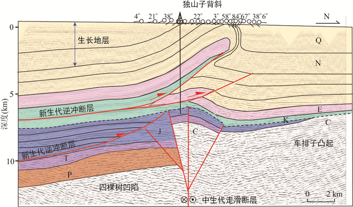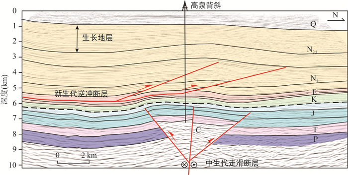 The fold-thrust belt in the northern piedmont of the Tianshan Mountains underwent polyphase tectonic deformation, acquiring its present configuration during the Late Cenozoic contractional regime. Under multiphase superposition, the influence of basement architecture on subsequent compressive deformation remains constrained. This study investigates the Mesozoic structural characteristics and deformation mechanisms in the northern piedmont of the Tianshan Mountains based on seismic, drilling, and field observation data, aiming to reveal the influence and controlling factors of Mesozoic structures on Cenozoic deformation and hydrocarbon migration-accumulation. Strike-slip faults were developed in the Mesozoic in the northern piedmont of Tianshan Mountain, and were covered by the Cretaceous-Cenozoic strata. Under the Late Cenozoic compression environment, the Mesozoic strike-slip fault was reactivated, and the Cenozoic thrust fault and fold superimposed on the Mesozoic fault. The reactivation of Mesozoic structures played an important role in shaping the present structure of the northern piedmont of Tianshan Mountain. According to the deformation sequence, the sedimentary strata in the southern Junggar basin. are divided into three structural layers—shallow, intermediate, and deep. These tiers correspond to upper, middle, and lower hydrocarbon accumulation assemblages, respectively, with the intermediate and deep structural tiers demonstrating particularly significant exploration potential. In this paper it reveals the relationship between deep faults and late compressive structures in the northern piedmont of Tianshan Mountain, explains the influence of multi-stage tectonic evolution on oil and gas exploration, and has reference significance for the study of similar structures in the basins of western China.