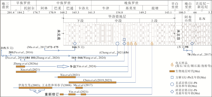 Influenced by multi-phase thrusting,extensional tectonic movements,and the plastic deformation of mudstone,shale,and gypsum,the deformation of the Biluoco oil shale stratum (BLS) in the Qiangtang basin is extremely complex. Additionally,controversies surrounding paleontological fossil evidence and isotopic geochronology have severely constrained the understanding of the lithological assemblages and their temporal attribution. In response to the intricate structural deformation of BLS,this study conducted detailed structural observations and profile measurements. Based on the thrust-fold system,the stratum was traced and correlated,dividing into three segments with seven types of lithological assemblages from bottom to top. Zircon U-Pb isotopic testing,along with zircon structure and genetic analysis,was performed on the sandstone of the lower segment and the basalt of the middle segment,yielding maximum depositional ages of 166 Ma and 154 Ma,respectively. Integrating regional context,it is concluded that the age of BLS ranges at least from the Middle Jurassic Bathonian to the Late Jurassic Tithonian,with the top possibly extending to the Early Cretaceous Berriasian. The determination of the age for BLS provides new insights for hydrocarbon exploration in the Qiangtang basin,as well as for studies on sedimentary tectonic evolution and oceanic anoxic events.