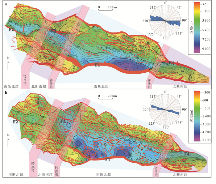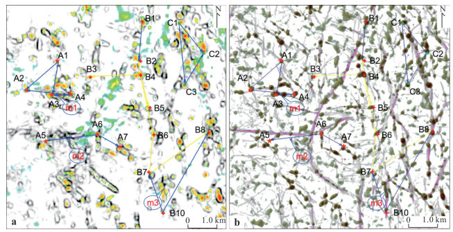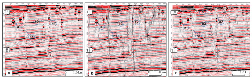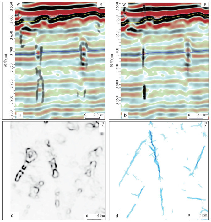 Carbonate reservoirs are important carriers of global oil and gas resources. The development characteristics of their internal karst caves and fault systems directly affect the storage and migration capacity of oil and gas. In order to solve the problem of multi-scale fault prediction in deep and ultra-deep carbonate reservoirs, this study takes the Ordovician carbonate rocks in the Tahe oilfield in the Tarim basin as an example and proposes a classification and grading fault prediction technology based on seismic wave field characteristic analysis. The interference mechanism of large-scale fracture-cavity bodies on conventional fault prediction attributes (such as coherence and maximum likelihood) is revealed through three-dimensional forward simulation, and it is found that the "beaded" reflection anomaly at the boundary of the fracture-cavity body will lead to false connectivity of faults and relocation deviation. Based on the differences in the scale and dissolution characteristics of the faults, the fault system in the study area is divided into large-scale broken-dissolution faults (> 20 m), medium-scale weak-undissolved faults (10-20 m) and small-scale fractures (< 10 m), and targeted prediction methods are developed for each of them: for large-scale faults, a fracture retrieval technology based on gradient structural tensor thinning is proposed to effectively overcome the interference of abnormal boundaries of karst caves; for medium-scale faults, the longitudinal continuity of the faults is significantly improved by combining AFE coherent enhancement attributes with U-Net deep learning algorithm; for small-scale fractures, the Likelihood attribute and structural guidance filtering are used to accurately extract weak reflection signals. Further, a well control multi-attribute fusion model is constructed by fusing multi-scale fault attributes and drilling loss data through deep feed forward neural network (DFNN). The application results show that this technology system has achieved full-scale characterization of the fault system in the complex fracture-cave area of Tahe oilfield. Large-scale strike-slip faults are distributed in a conjugate NNE-NNW direction, medium-scale faults form flower-like structures, and small-scale fractures are densely developed on the active disk (east side) of the fault. This study provides a new technical approach for the prediction of deep carbonate reservoir faults and has important reference value for the exploration and development of similar oil and gas reservoirs.