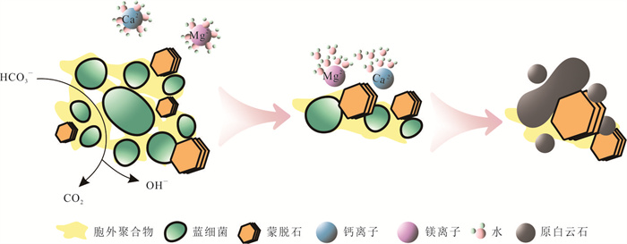 The formation mechanism of dolomite [CaMg(CO3)2] remains a longstanding enigma in earth sciences. Previous studies have identified certain microorganisms and clay minerals as catalysts in the crystallization of low-temperature protodolomite, a crucial precursor to ordered dolomite. However, the role of cyanobacteria and particularly their potential synergistic effects with clay minerals remain poorly understood. In this study, we investigated bioprecipitation of carbonate minerals using the halotolerant cyanobacterium Synechococcus elongatus FACHB-410 in the presence and absence of montmorillonite. Our results demonstrated that protodolomite occurred as the predominant solid product in the montmorillonite-amended biosystems as confirmed by X-ray diffraction (XRD) and Raman spectroscopy, whereas monohydrocalcite and low-magnesian calcite were the primary products in the montmorillonite-free biosystems. Multiple microscopic techniques, including scanning electron microscopy (SEM), focused ion beam microscopy (FIB-SEM), and transmission electron microscopy (TEM), revealed that protodolomite nucleated as nanocrystals preferentially on montmorillonite surfaces. Density functional theory (DFT) simulations further elucidated that surface electronegativity of montmorillonite played a key role in promoting protodolomite formation by strongly adsorbing Mg2+ ions through electrostatic interactions, thereby facilitating their dehydration and significantly lowering the nucleation energy barrier.