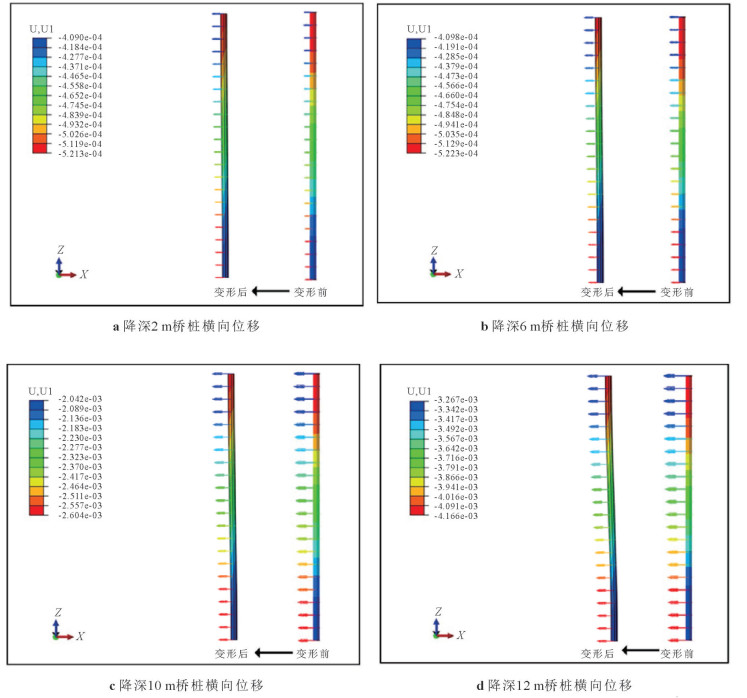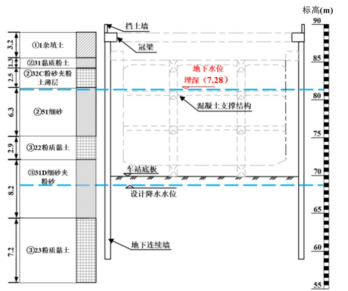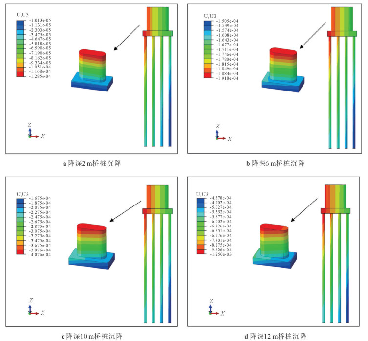 Aiming at the impact of dewatering in metro deep foundation pits on the deformation and safe operation of adjacent high-speed railway bridge piles, this study investigates the mechanism of pile-soil interaction under seepage-stress coupling effects and proposes effective collaborative control measures. Through field pre-dewatering tests, variations in groundwater levels and surface settlement around bridge piles under different drawdown conditions were monitored. Using Abaqus for numerical simulation, a seepage-stress coupling model was established to analyze the influence of different dewatering depths on the lateral friction resistance and neutral point position of pile foundations, with comparative analysis against field data to summarize variation patterns.As the dewatering depth increases, the disturbed seepage field gradually extends toward the pile foundation, forming a seepage flow pattern around the piles. The deformation of the pile foundation exhibits nonlinear growth, with significant increases in settlement and lateral deformation observed after exceeding a 10 m drawdown. Negative skin friction in the upper part of the pile increases, the neutral point shifts downward, and positive skin friction at the pile base enhances.The deformation of bridge piles adjacent to metro deep foundation pits during dewatering is considerably influenced by the dewatering depth. Collaborative control measures such as multi-stage dewatering, waterproof curtains, real-time water level monitoring, and recharge can be adopted to mitigate pile deformation and ensure the operational safety of high-speed railways.