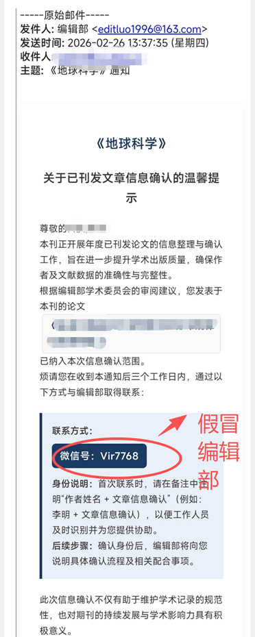 近期,《地球科学》编辑部接连接到作者举报,有不法分子通过假冒《地球科学》编辑,向作者发送虚假邮件,添加作者微信,并诱骗作者提交稿件信息(例如:以“对已刊发文章信息确认”“关于稿件深度指导的说明”“学术复核邀请”等名义联系),该行为严重损害《地球科学》编辑部的声誉及广大投稿者的权益,干扰正常出版秩序。为此,编辑部严正声明如下: